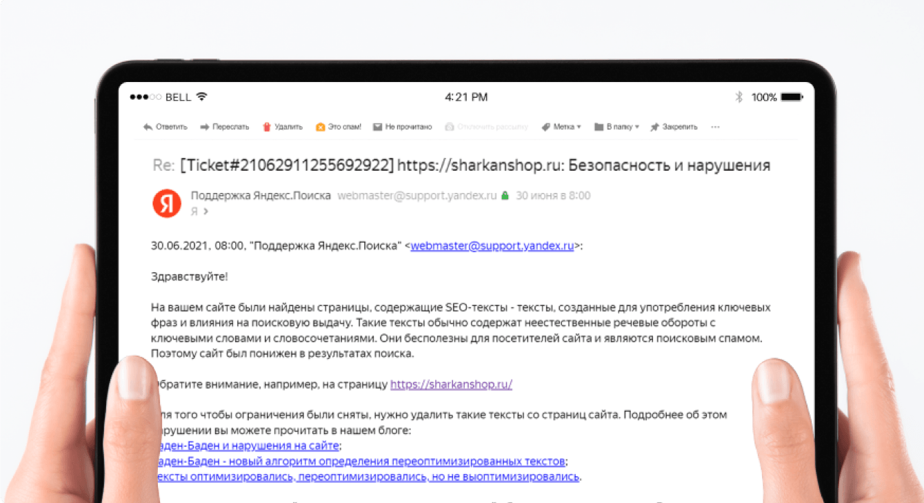 Сайт клиента попал под фильтр «Баден-Баден» от поисковой системы Яндекс, позиции интернет-магазина резко упали.