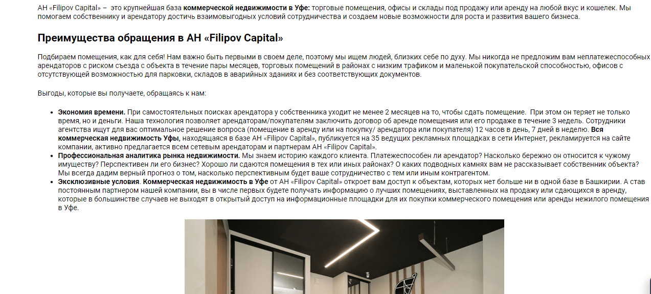 Клиент - это агентство коммерческой недвижимости в Уфе. Стояла задача выйти в первые страницу яндекса и гугла. До обращения были на 7-10 странице.