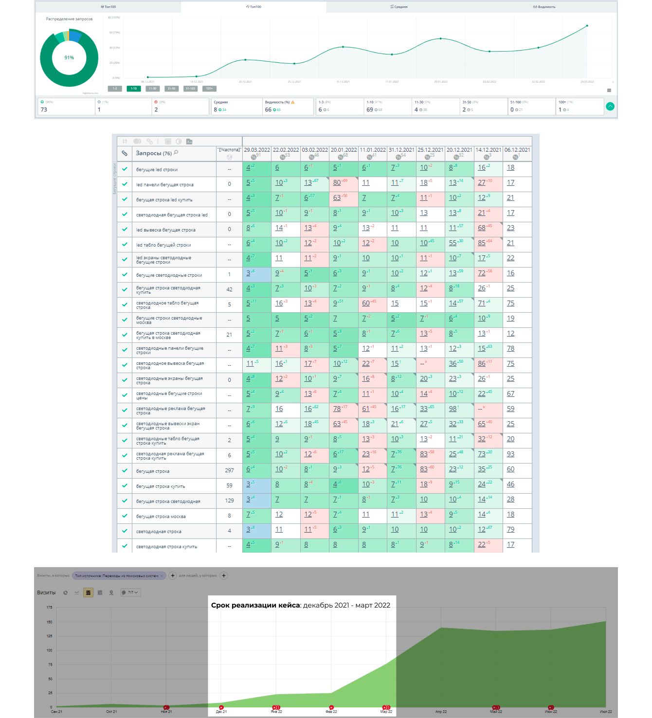 После разработки сайта мы приступили к поэтапной оптимизации разделов оборудования. Один из приоритетных разделов для бизнеса - бегущие строки. Поставили задачу в минимальные сроки вывести максимальное количество запросов в ТОП и увеличить трафик на раздел.