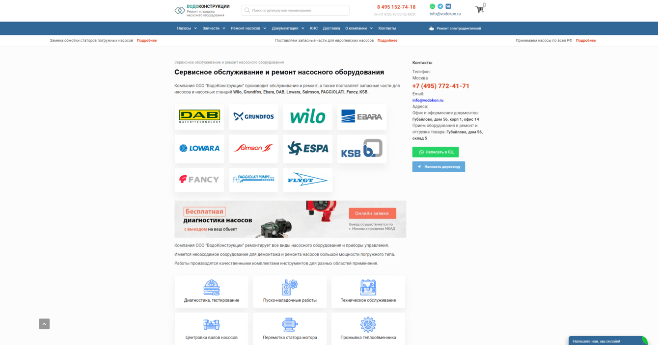 Были оптимизированы и внедрены рекомендации по оптимизации страниц, так же внедрены новые страницы на типы услуг по ремонту и обслуживанию насосного оборудования различных брендов.