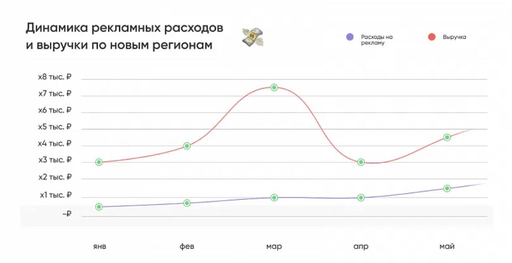 В то время как мы первые несколько месяце раскачивали продажи по Москве, в регионах уже на старте был значительно положительный ROI. Эти кампании позволили получить значительный рост продаж и выручки в первые три месяца своей работы. Однако затем, в марте, когда у нас наконец выстрелила Москва, в связи со сложной ситуацией в стране кампании по регионам начали давать некоторую просадку.