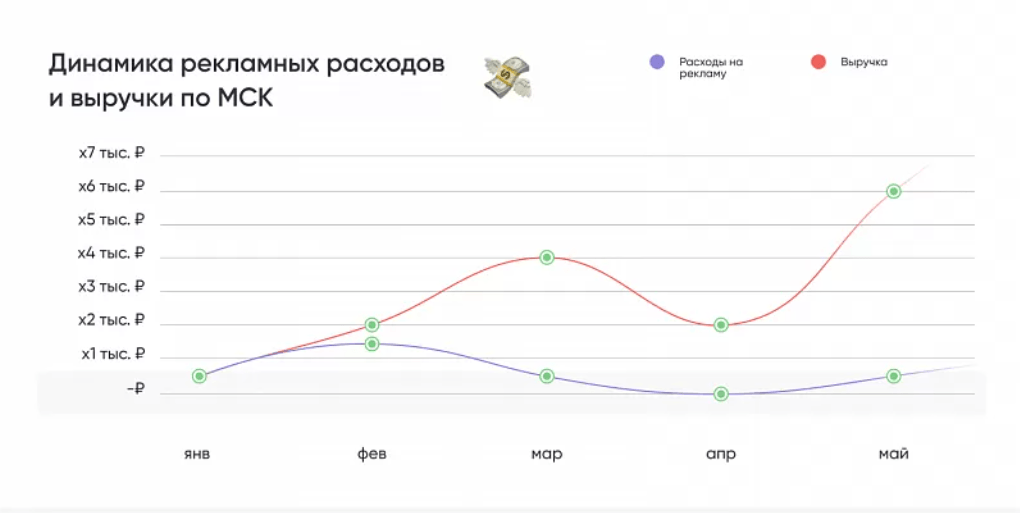 В то время как мы первые несколько месяце раскачивали продажи по Москве, в регионах уже на старте был значительно положительный ROI. Эти кампании позволили получить значительный рост продаж и выручки в первые три месяца своей работы. Однако затем, в марте, когда у нас наконец выстрелила Москва, в связи со сложной ситуацией в стране кампании по регионам начали давать некоторую просадку.