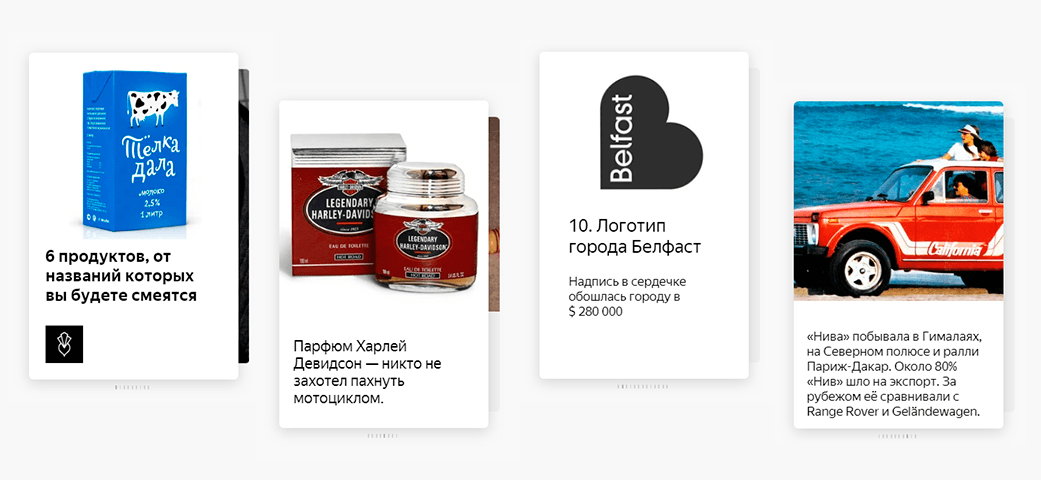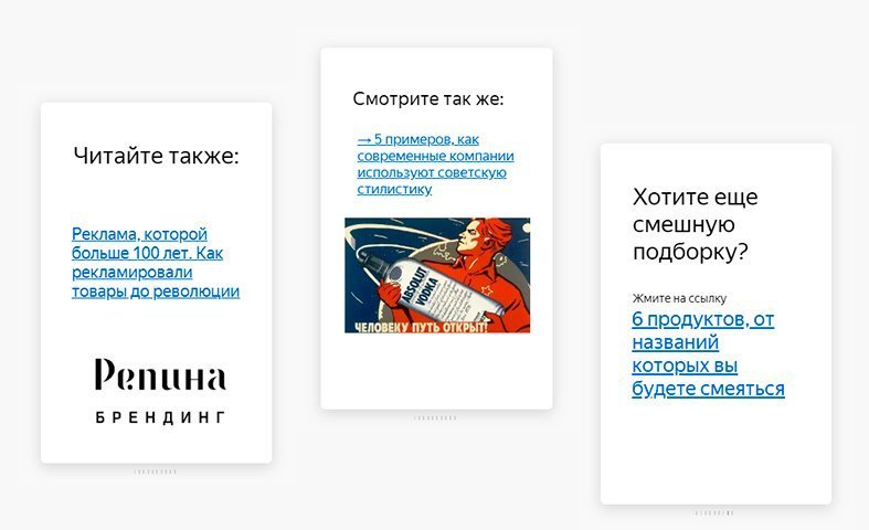 В конец каждого нарратива стали добавлять ссылку на другий нарратив, близкий по теме. В конце смешной подборки — другая смешная подборка. В конце материала про самые древние бренды — примеры рекламы в царской России.