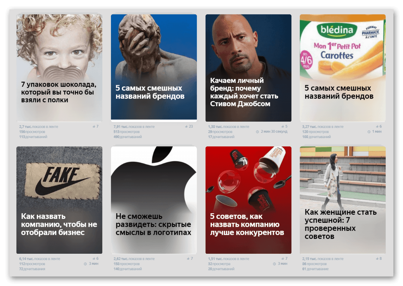 Статьи про брендинг читают плохо, их отбросили сразу. Вместо них сосредоточились на тематических подборках: фейлы дизайнеров, провальный и удачный нейминг, самые дорогие логотипы, успешные бренды из СССР и так далее.