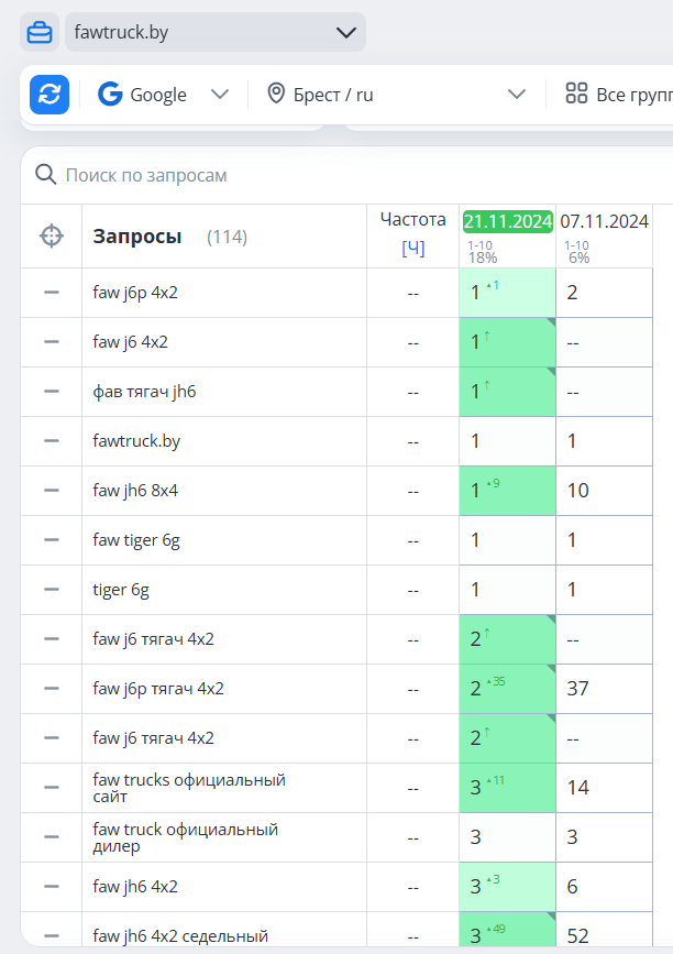 По многочисленным запросам сайт находится в ТОП-5, причем можем заметить скачок по «faw jh6 8×4», «faw jh6p тягач 4×2», «faw trucks официальный сайт», «faw jh6 4×2 седельный».