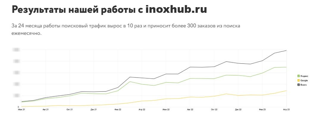 За 24 месяца работ по SEO-продвижению поисковый трафик вырос до 10 000+ пользователей в месяц: +900% из ПС Яндекс, +3300% из ПС Google.