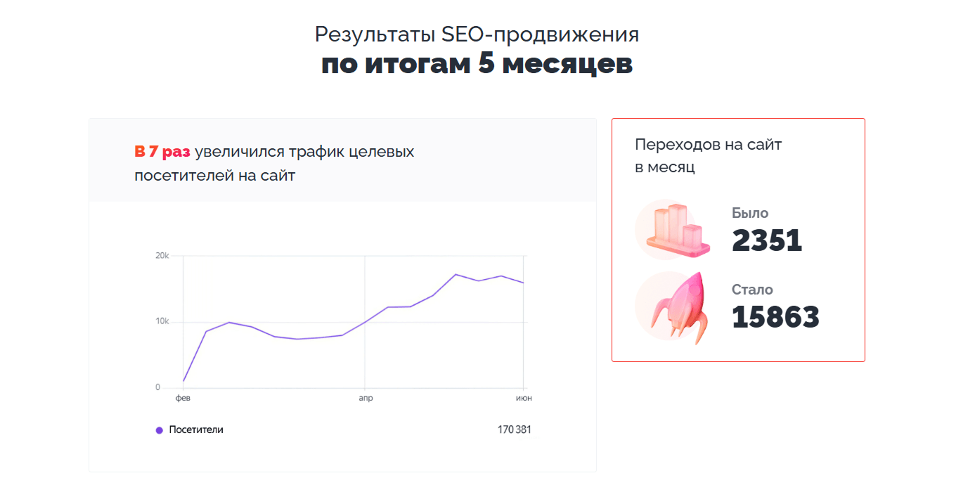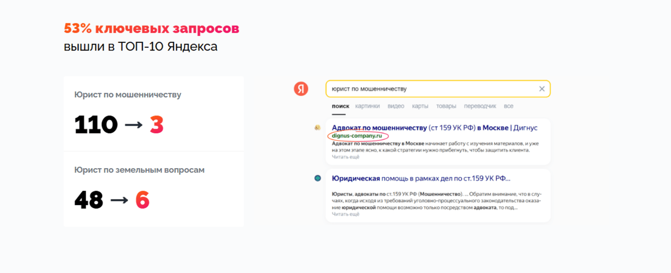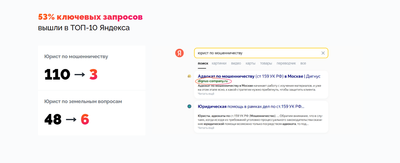Вносим корректировки, чтобы сайт оставался актуальным. Постоянный прирост по позициям в поиске каждый месяц.