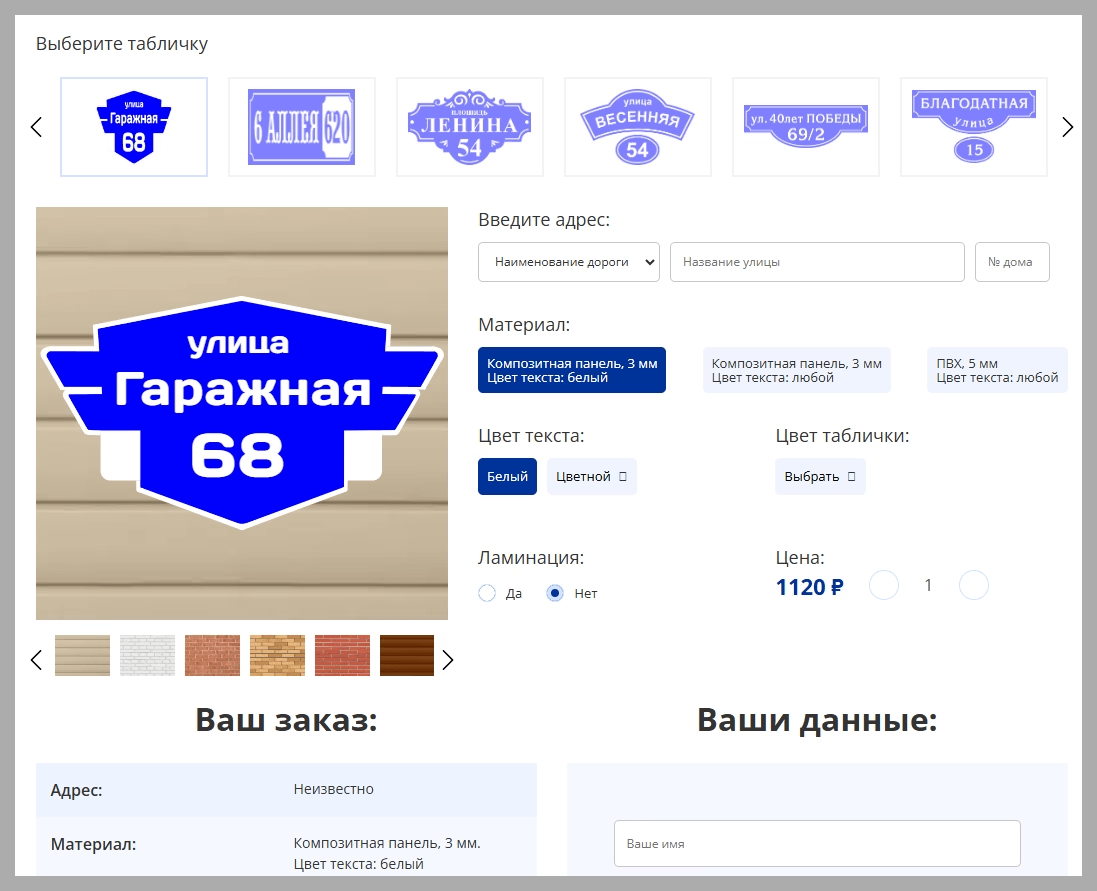 Этот инструмент позволяет клиентам самостоятельно создавать макеты адресных вывесок, выбирать материалы, размеры и другие параметры, а затем мгновенно получать расчет стоимости. Калькулятор адаптивен и отлично работает на мобильных устройствах с любым разрешением. Такая функция значительно увеличила вовлеченность пользователей, сделав страницу адресных табличек лидером по количеству суммарных визитов и времени, проведенному на странице. Кроме того, это решение оптимизировало производство. Теперь заказчик получает не только номер телефона, но и техническое задание на конкретный макет таблички.