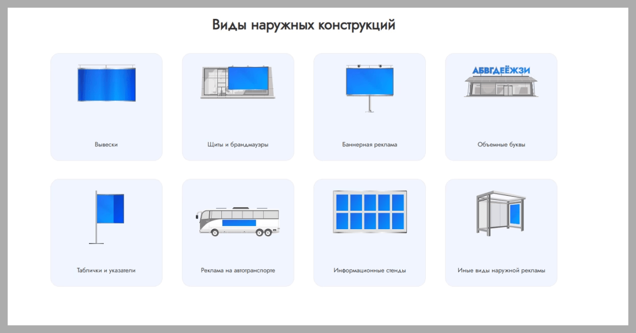 Мы создали специальные карточки для каждого вида наружной рекламы, чтобы клиенты могли наглядно увидеть, как их объявление будет выглядеть в разных форматах. Это помогло лучше понять особенности каждого типа рекламы, и количество заказов на брандмауэры увеличилось втрое.
