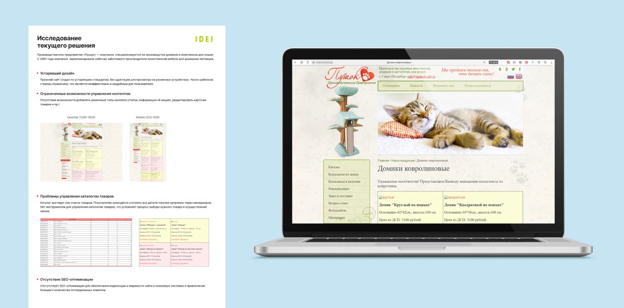 Первым шагом стал тщательный аудит существующего сайта «Пушок» и глубокое погружение в детали проекта. На встречах с заказчиком мы выявили ключевые запросы и цели, которые должен был решить новый интернет-магазин. Основные проблемы, с которыми мы столкнулись, включали устаревший дизайн, ограниченные возможности управления контентом и отсутствие эффективного SEO. Эти выводы легли в основу нашего подробного плана нашего нового проекта.