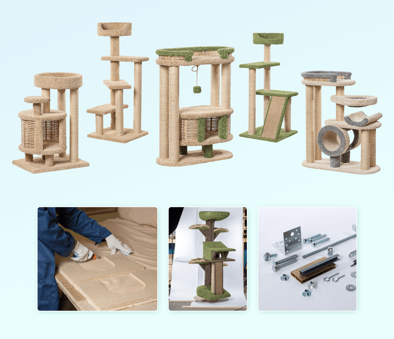 Одним из наших креативных технических решений является создание 3D-вариатора комплексов для питомцев. Он позволяет в пару кликов увидеть, как будет смотреться домик в интерьере! Для комплексов были разработаны 3D модели, которые можно рассмотреть со всех сторон - и для этого потребуется только навести камеру и указать место.