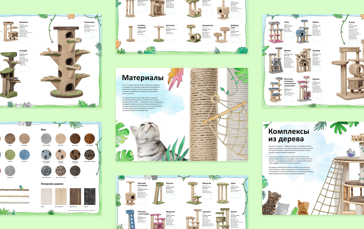 В дополнение к каталогу на сайте, мы сделали яркий каталог, в котором использовали фотографии домиков и когтеточек со съёмок.