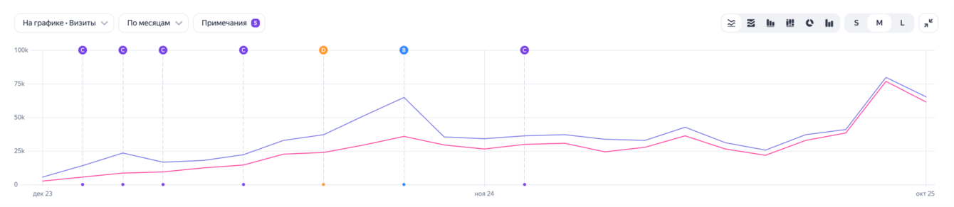 Регулярные аудиты и комплексный подход дали отличные результаты роста видимости сайта и трафика.