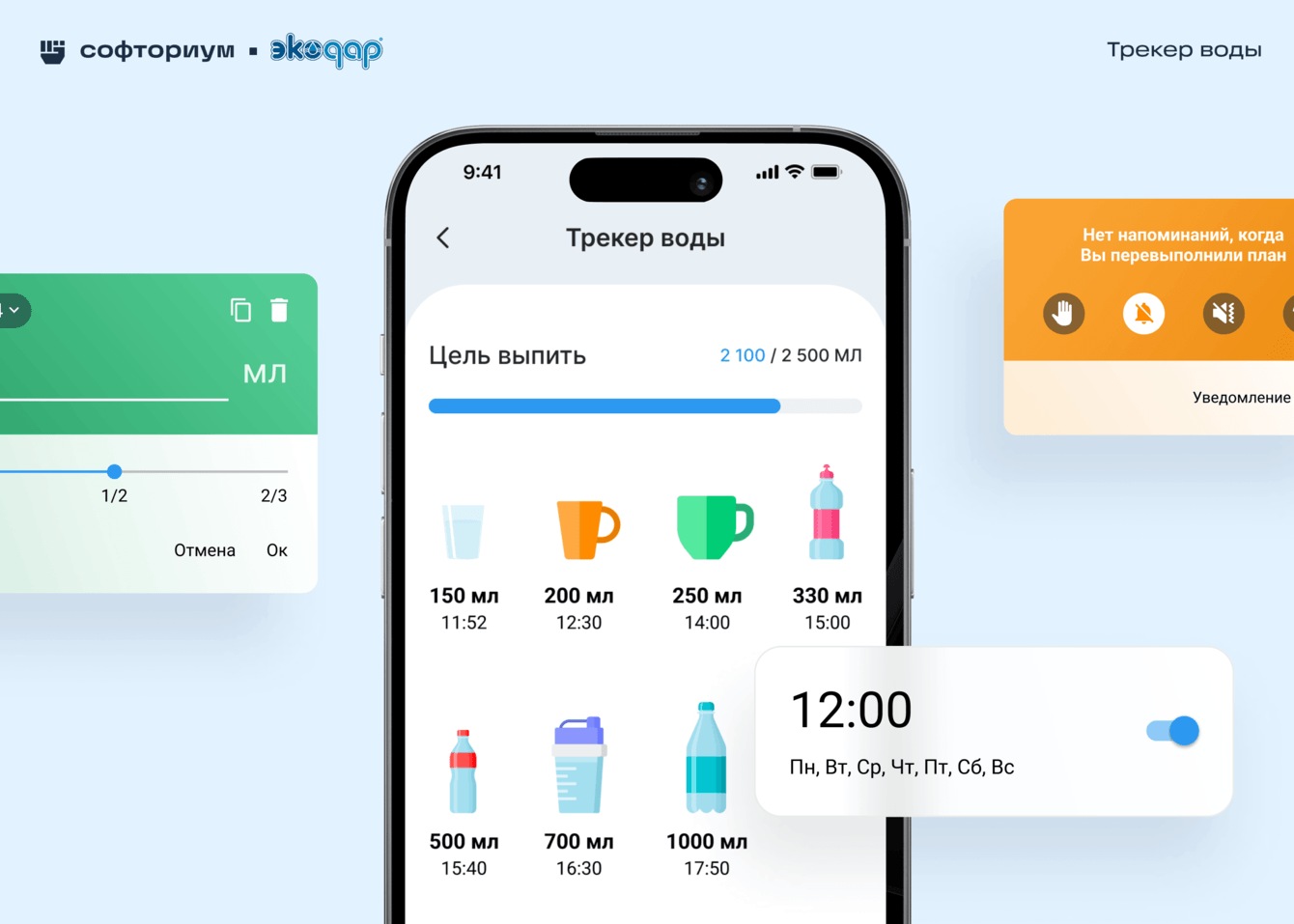 В приложении можно сформировать отчет о режиме питья, об изменении веса, настроить уведомления о необходимости выпить воду.
