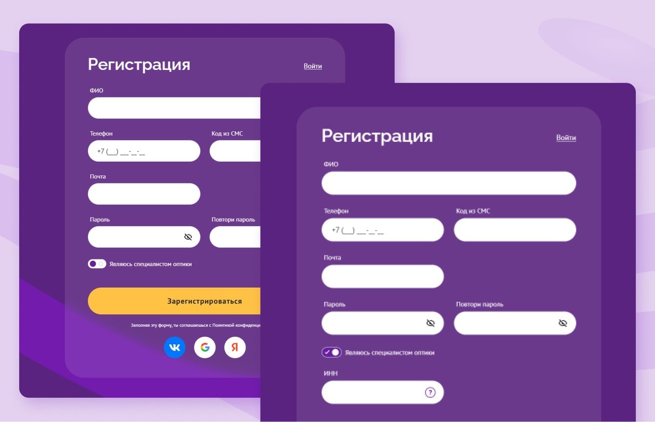 Когда все маршруты пользователя по видимым разделам сайта были спроектированы и стилизованы, настала пора личного кабинета. С этого шага аудитория разделяется, происходит это на этапе регистрации.