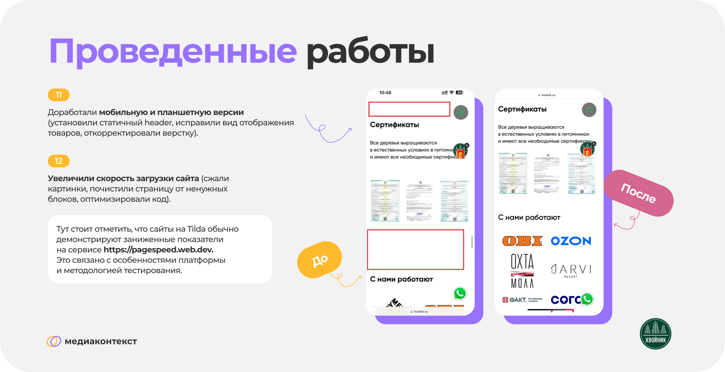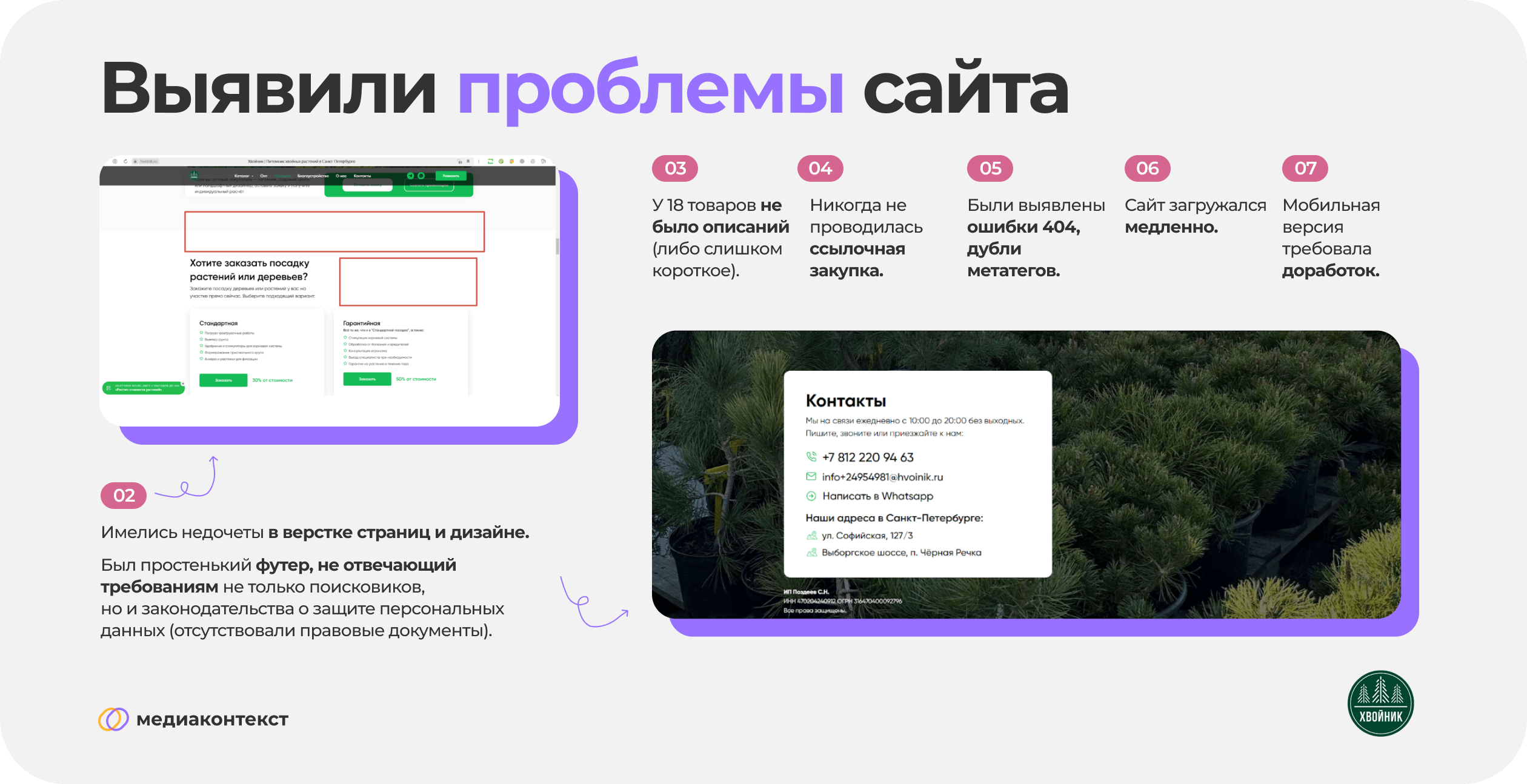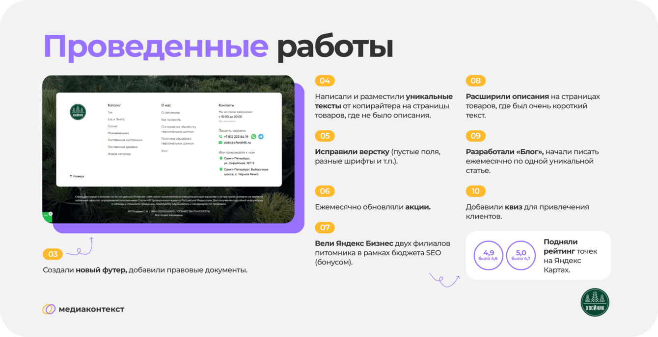 Мы получили в продвижение сайт питомника хвойных растений в Санкт-Петербурге на CMS Tilda. Для выполнения указанных задач было реализовано следующее: