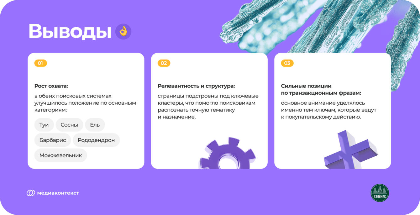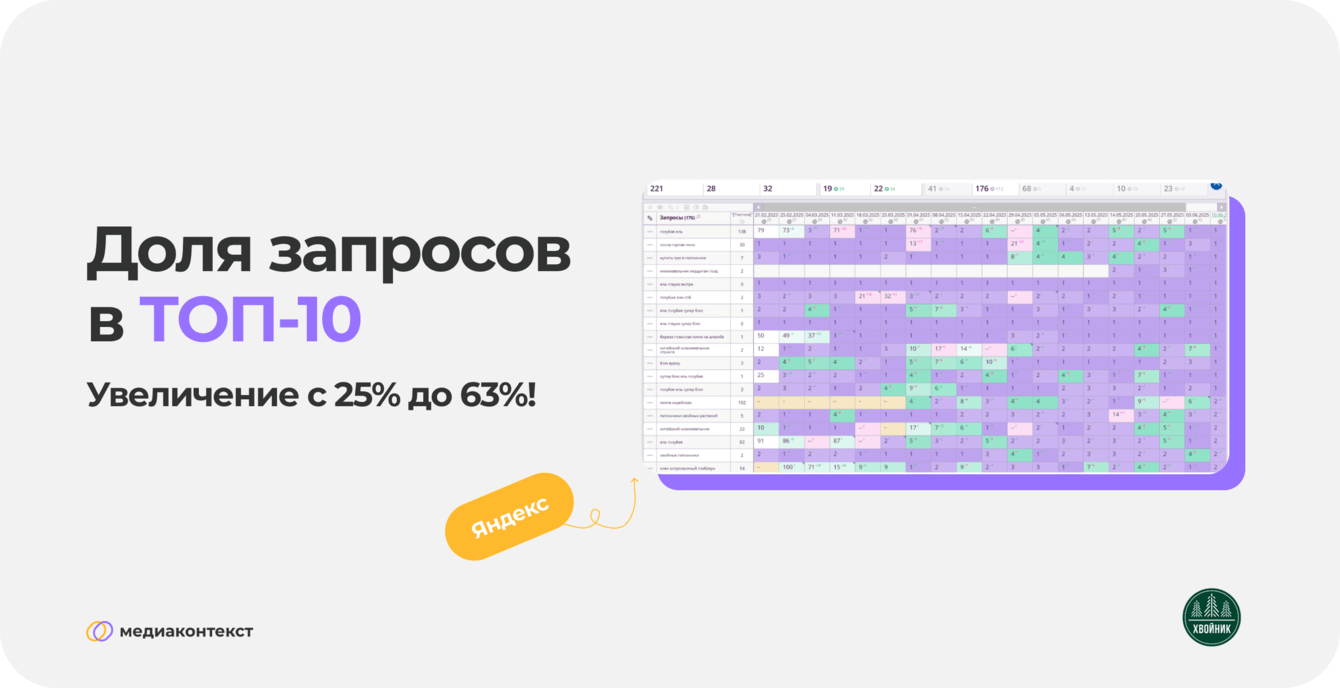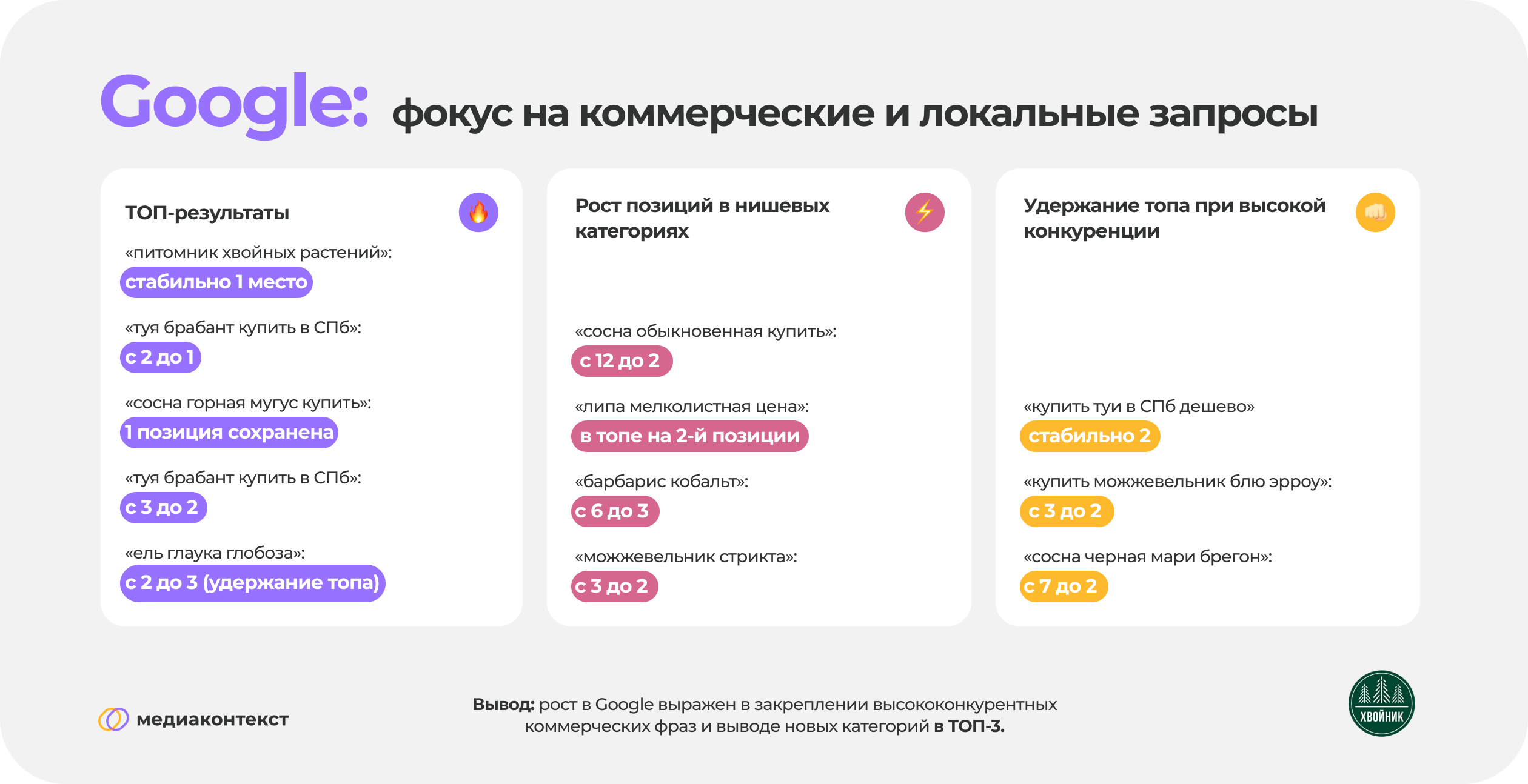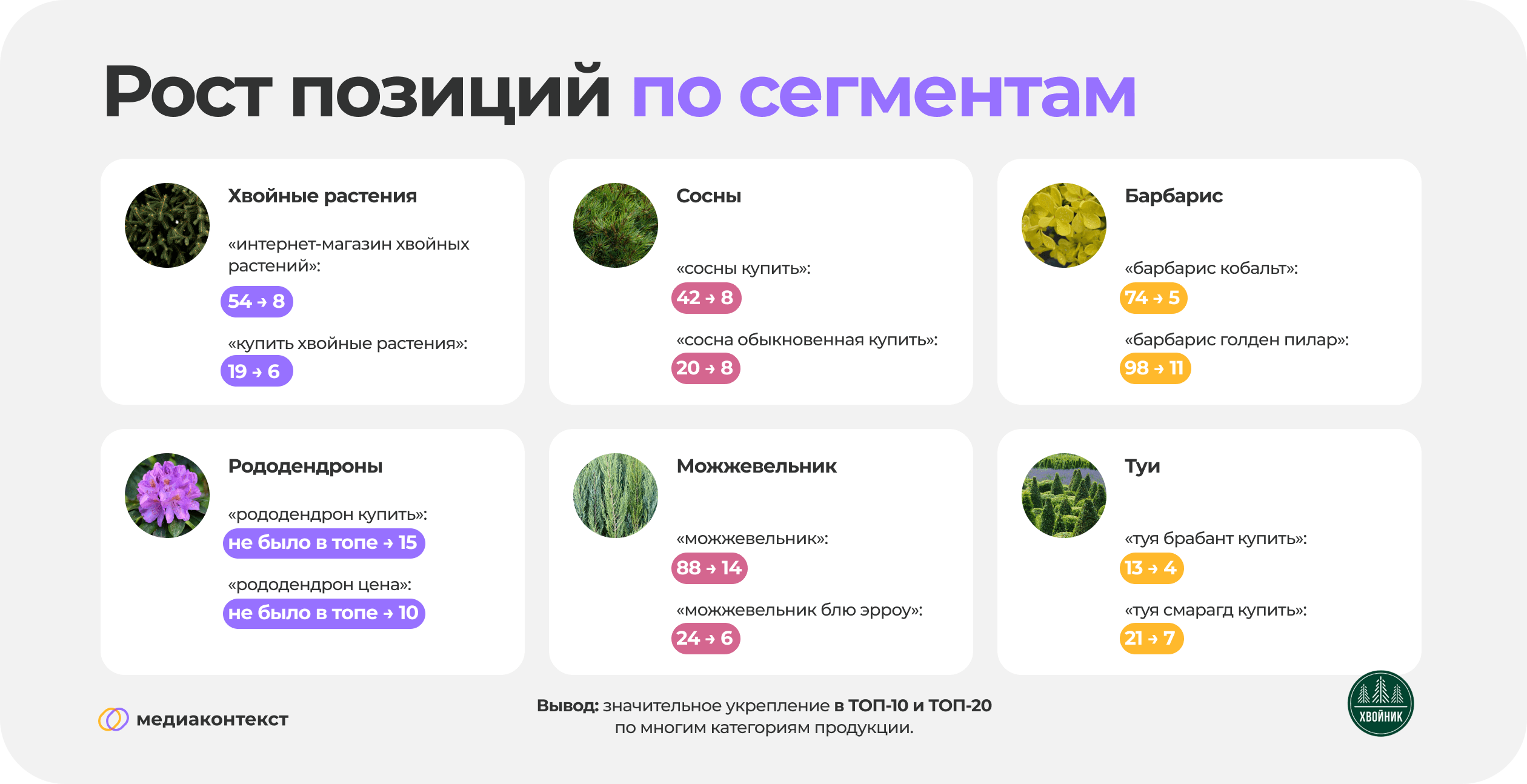 Укрепление в ТОП-3 и ТОП-5 по высококонкурентным коммерческим запросам (например, «сосна обыкновенная купить» с 20→8).