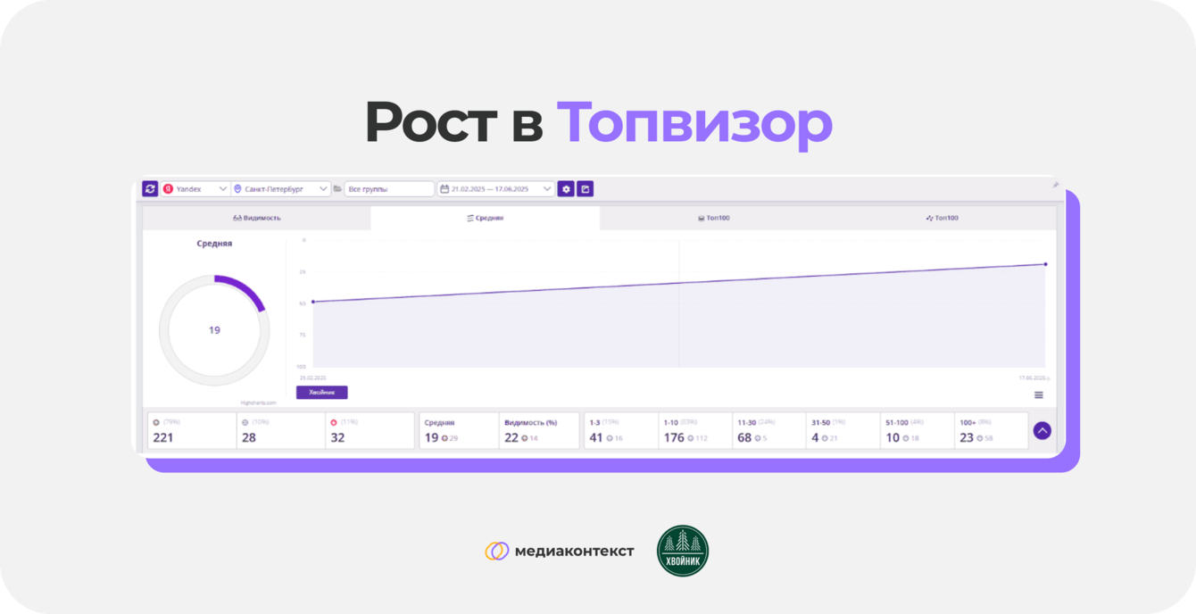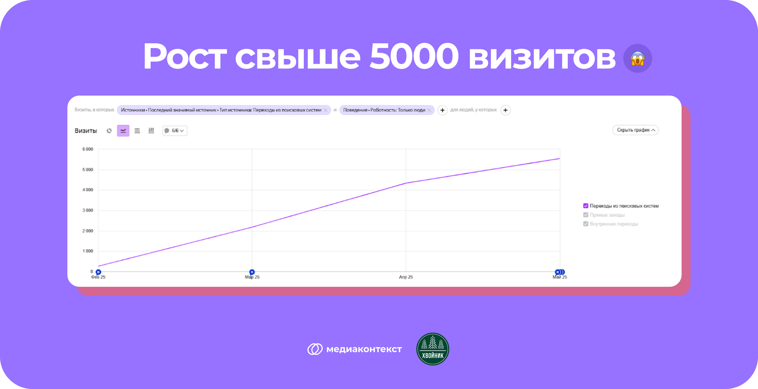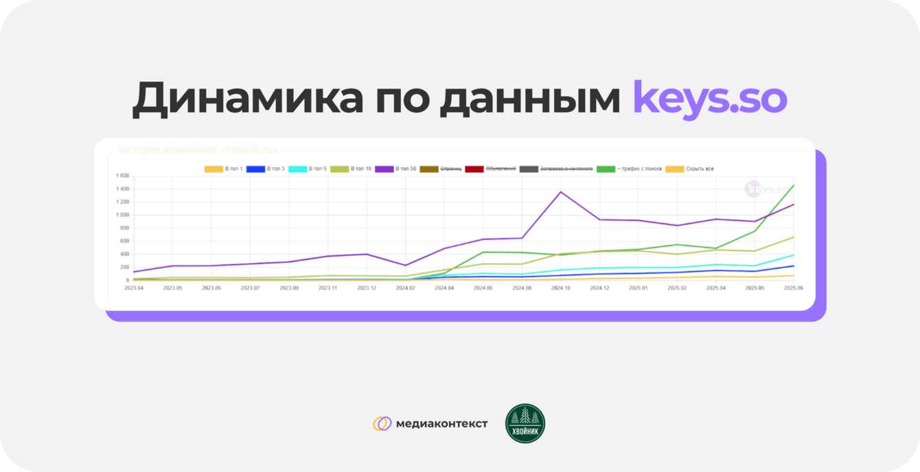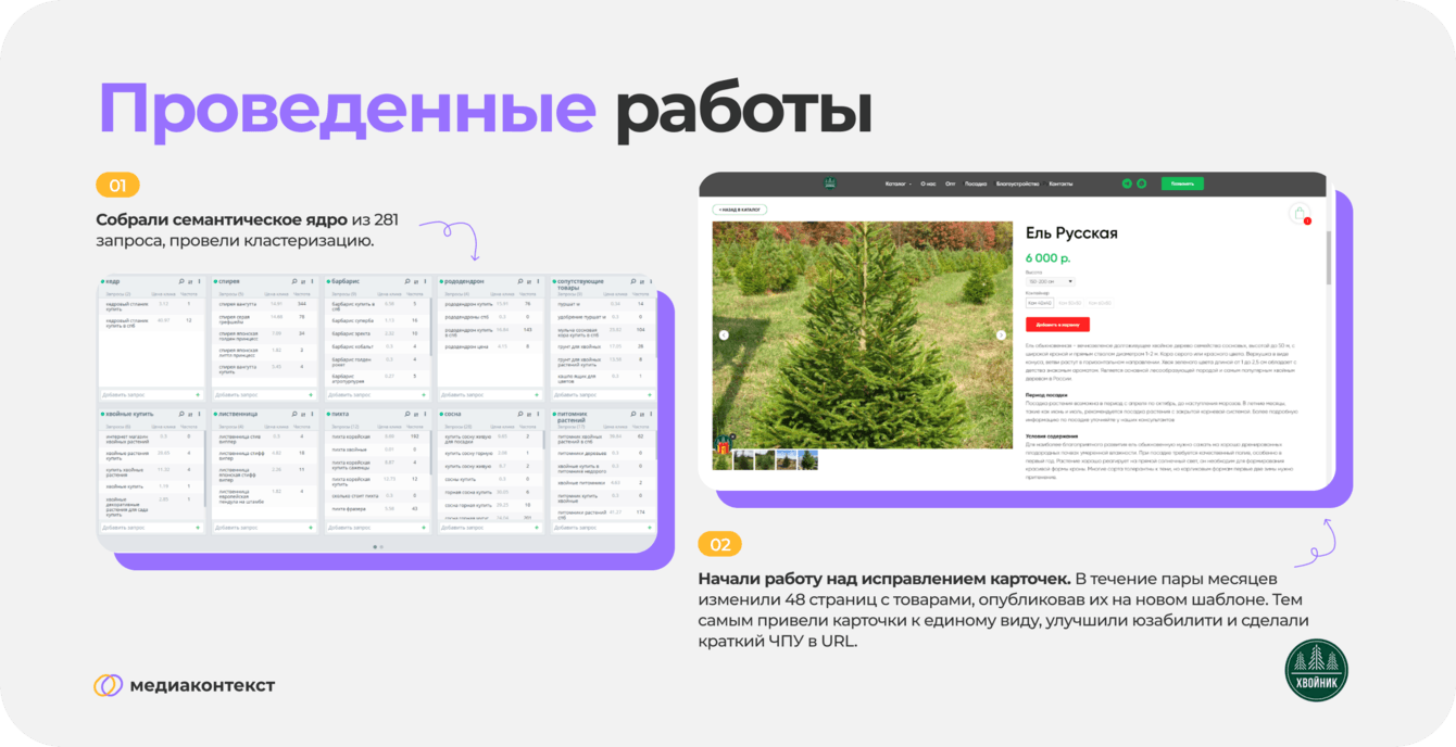 Укрепление в ТОП-3 и ТОП-5 по высококонкурентным коммерческим запросам (например, «сосна обыкновенная купить» с 20→8).