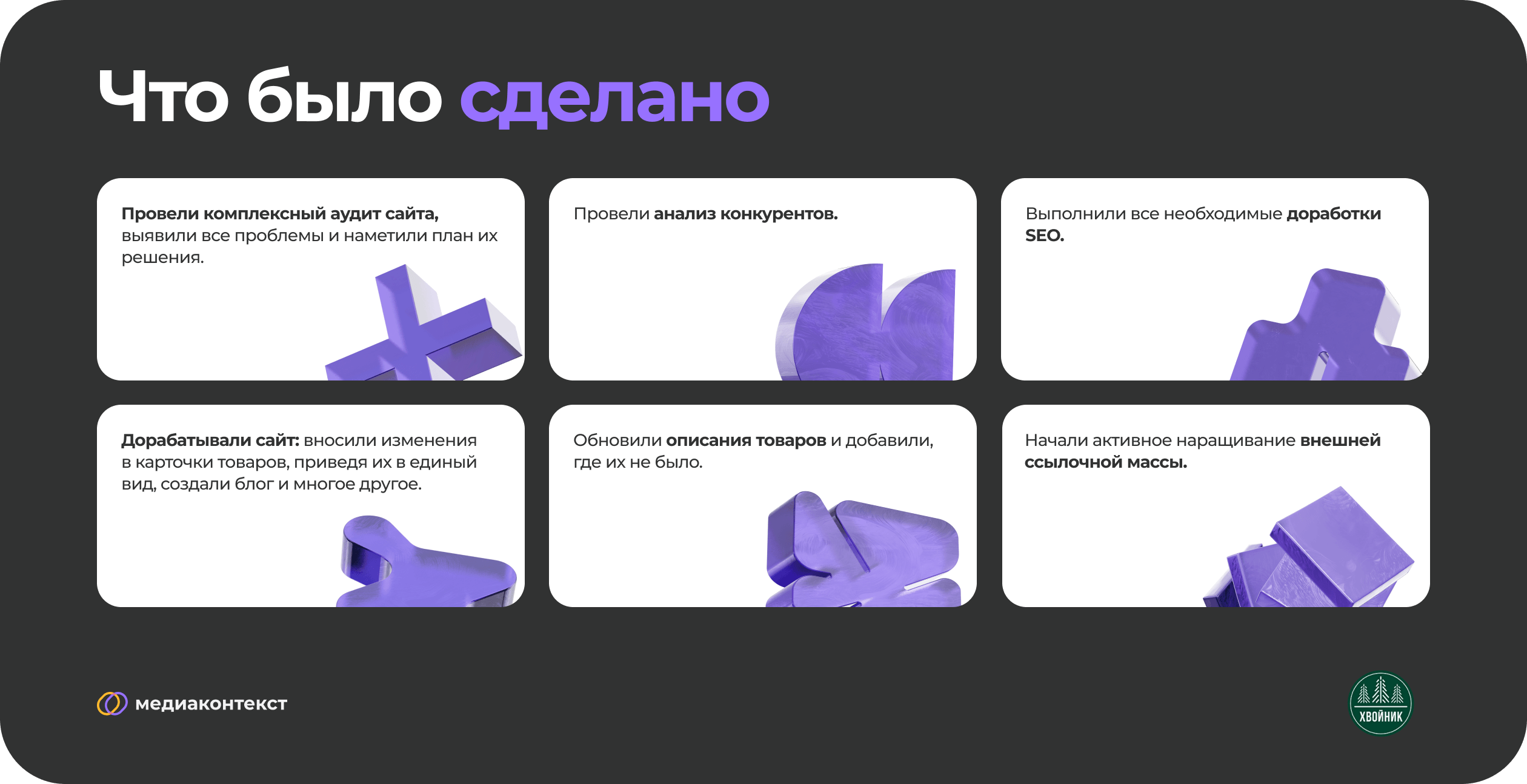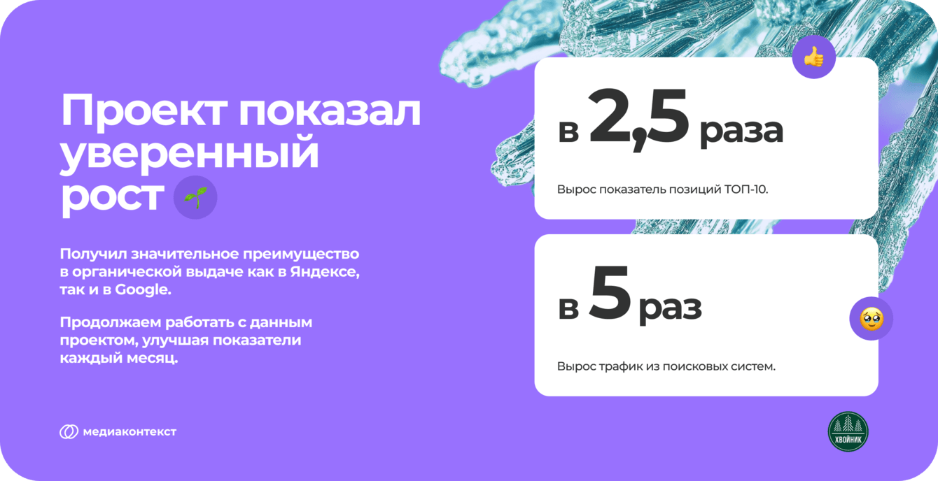 За 4 месяца SEO-продвижения сайта hvoinik.ru на Tilda достигнуты следующие ключевые показатели: