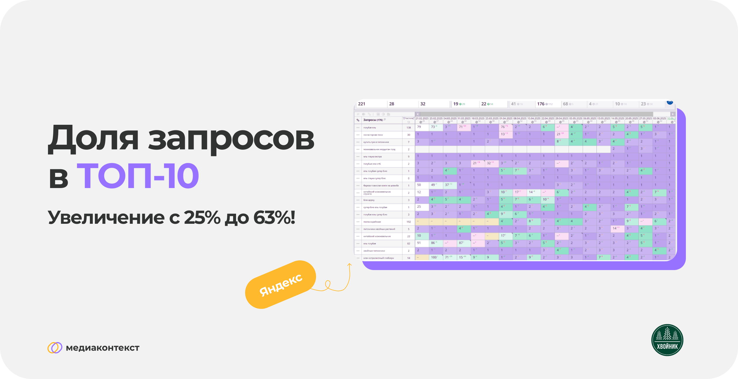 Доля запросов в ТОП-10 Яндекс выросла с 25% до 63% (+38%).