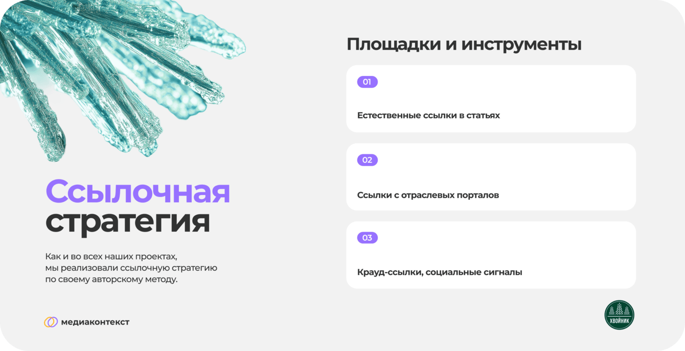Ссылочная стратегия: размещение качественных ссылок усилило авторитетность сайта.