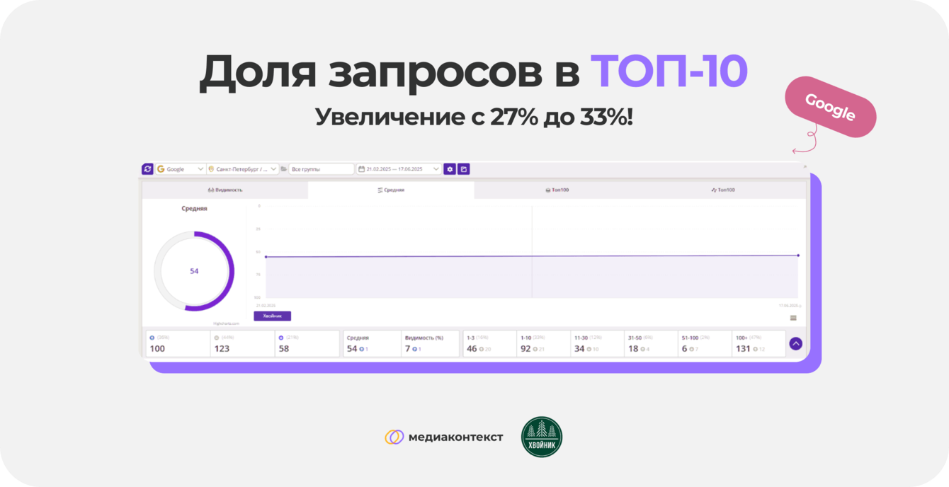 Доля запросов в ТОП-10 Google увеличилась с 27% до 33%.