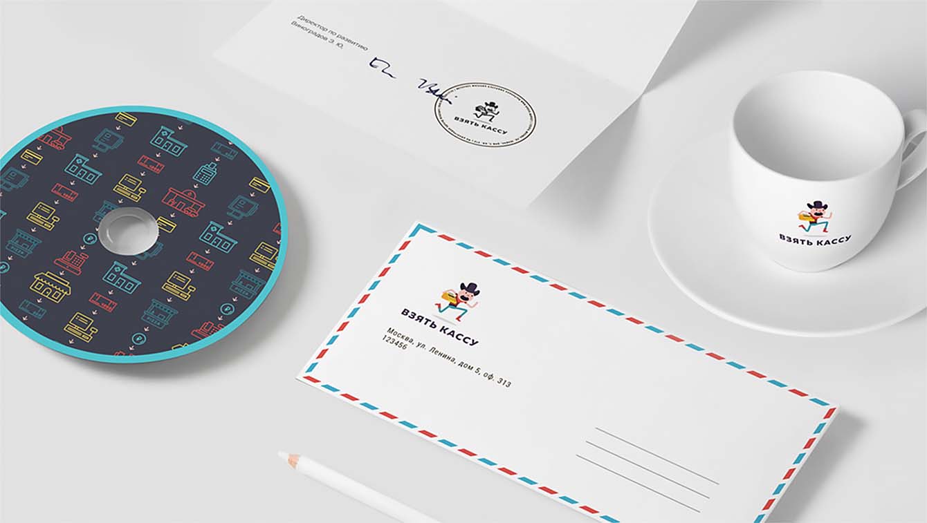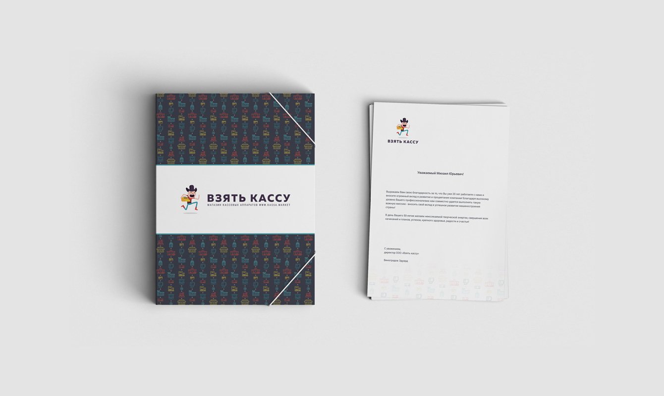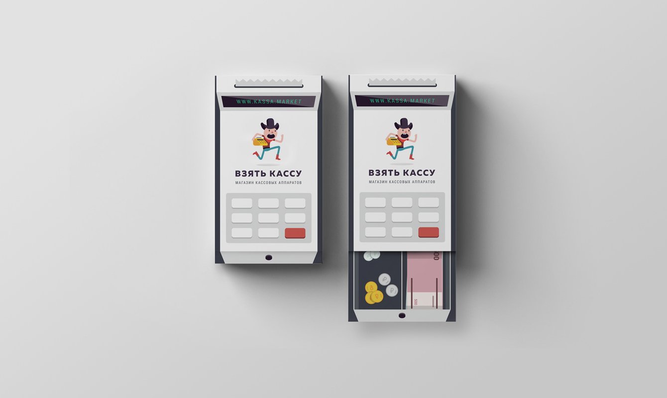 Динамичный логотип подчеркивает провокационность «ковбойского» названия. Персонаж в логотипе всем своим видом показывает что «взял кассу». Из шести фирменных цветов строится паттерн в котором рассказывается о круговороте денег, товаров и услуг, где кассовые аппараты имеют очень важную роль.