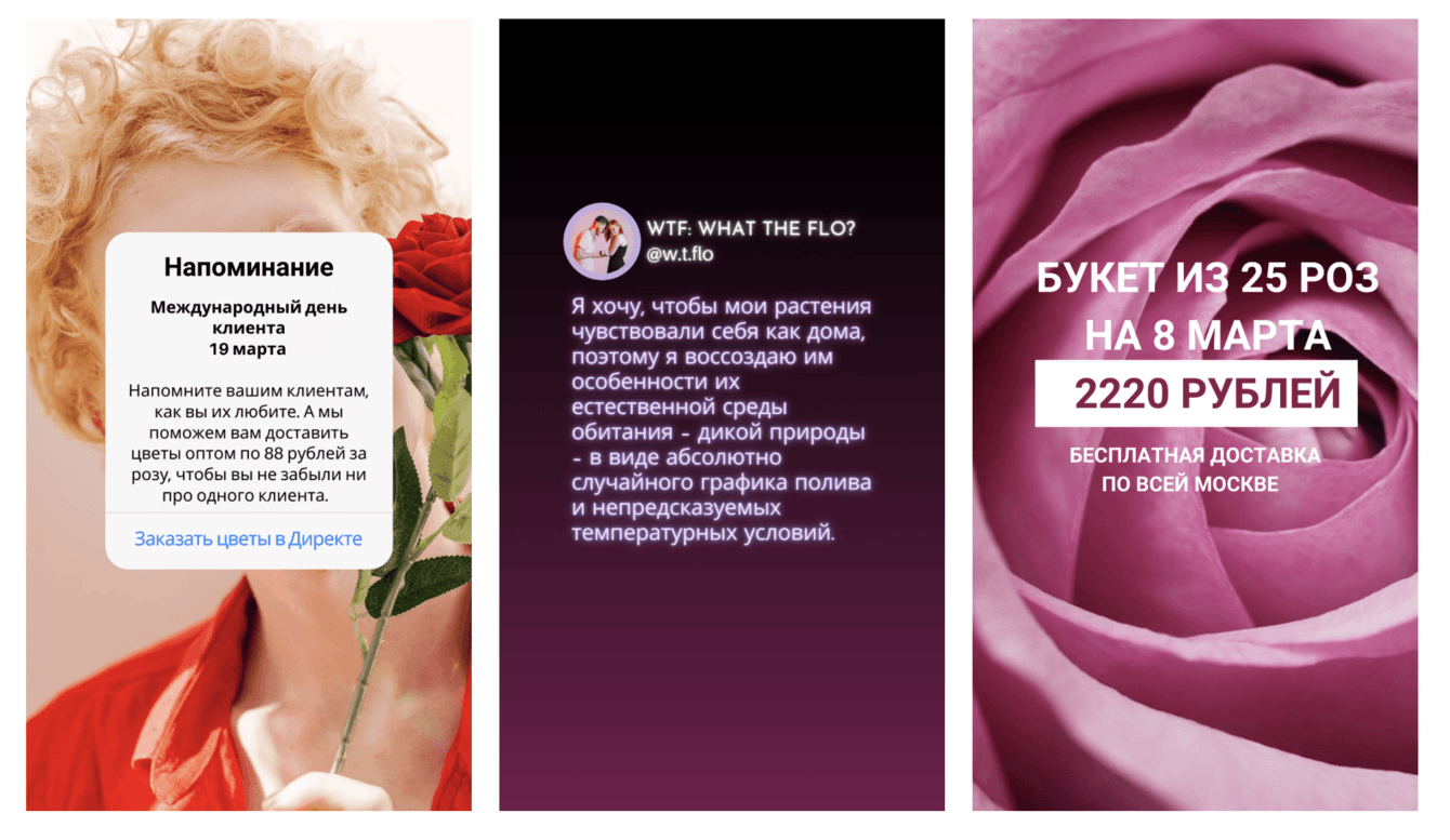 В связи с тем, что в проекте присутствовал монопродукт - розы, было принято решение о создании концепции в стиле трэш. Разработали tone of voice, рубрики для stories, продающие материалы. Мы прописали каждый кадр, который должен был получиться. Подобрали к нему идею для поста и референсы.