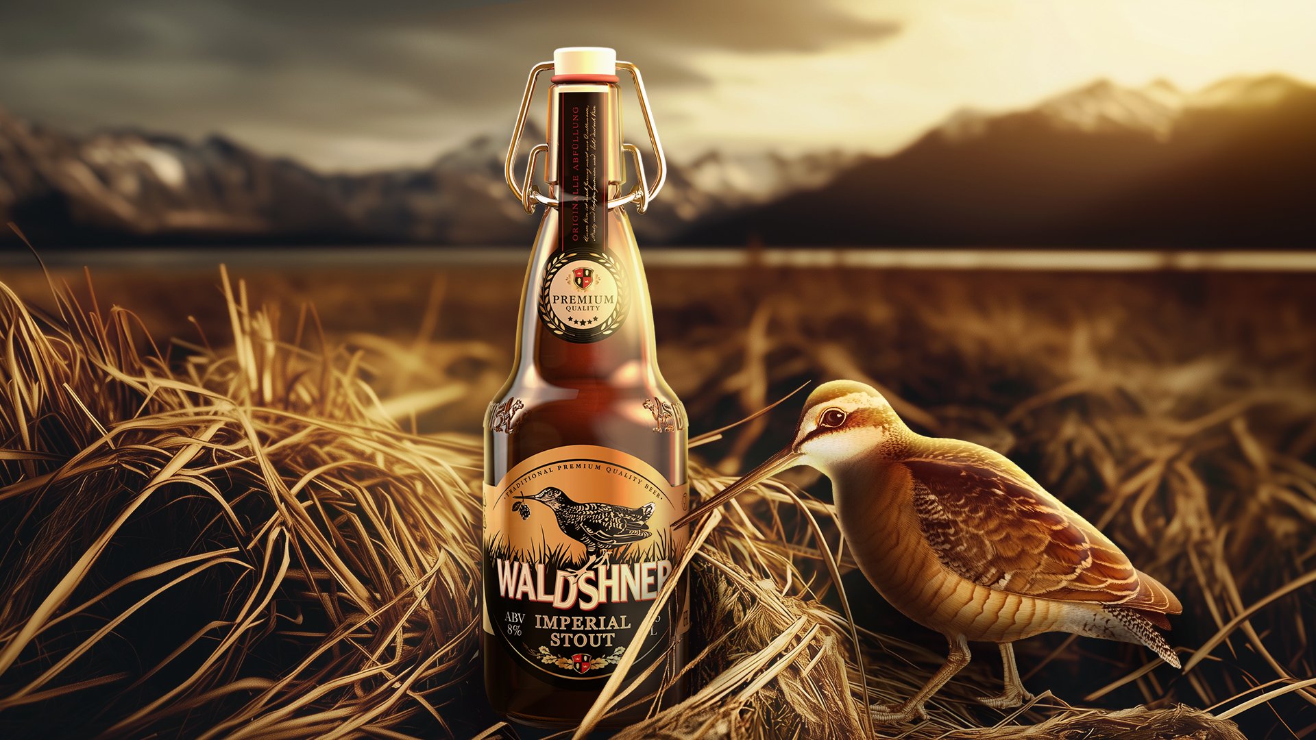 Дизайн этикетки стал визуальным воплощением концепции бренда. Доминантой композиции выступает крупное изображение вальдшнепа. Фон в виде травы отсылает к среде обитания птицы, а ее взаимодействие с буквами логотипа (вальдшнеп словно шагает по ним) придает ему динамики и уникальности. Цветовая гамма подчеркивает премиальность и традиционность напитка.