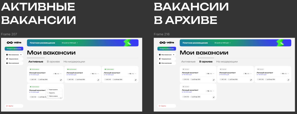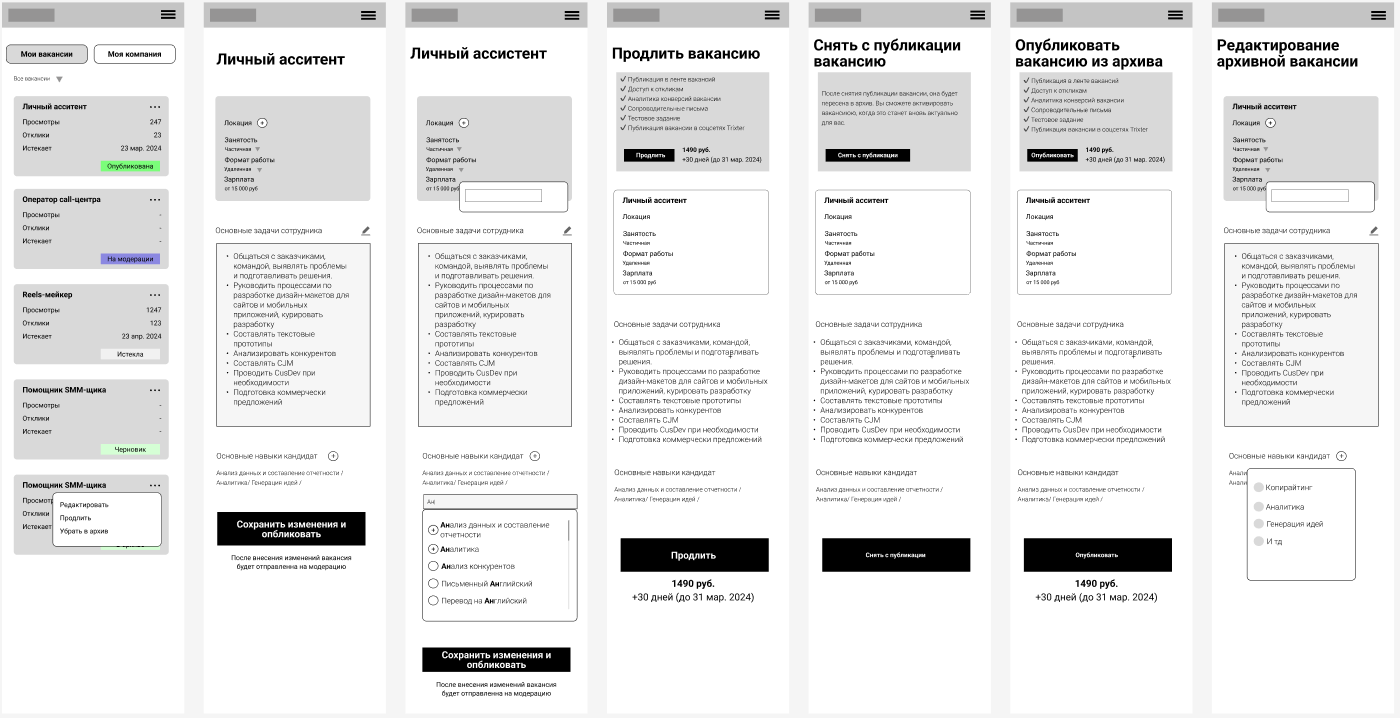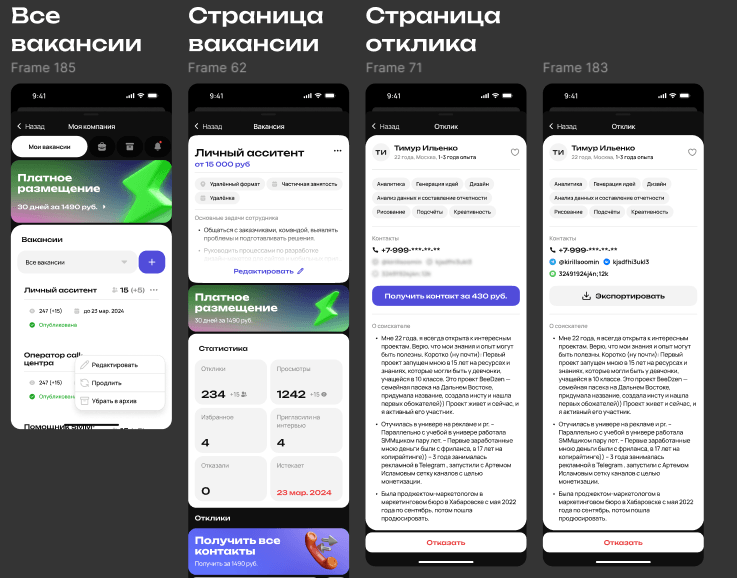 От прототипа перешли к проработке интерфейса, сохранив фокус на простоте и скорости действий для двух разных ролей — соискателя и работодателя. Важно было, чтобы продукт выглядел современно, но оставался предсказуемым и удобным.