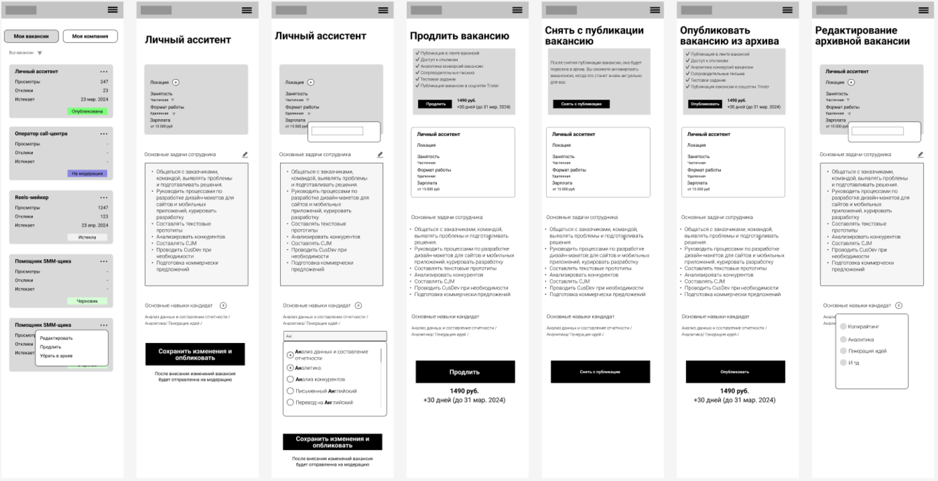 На основе результатов исследования мы собрали и структурировали пользовательские сценарии для соискателей и работодателей, затем спроектировали прототип. Это помогло заранее выстроить понятную навигацию и логику взаимодействия, прежде чем переходить к визуальной части и разработке.