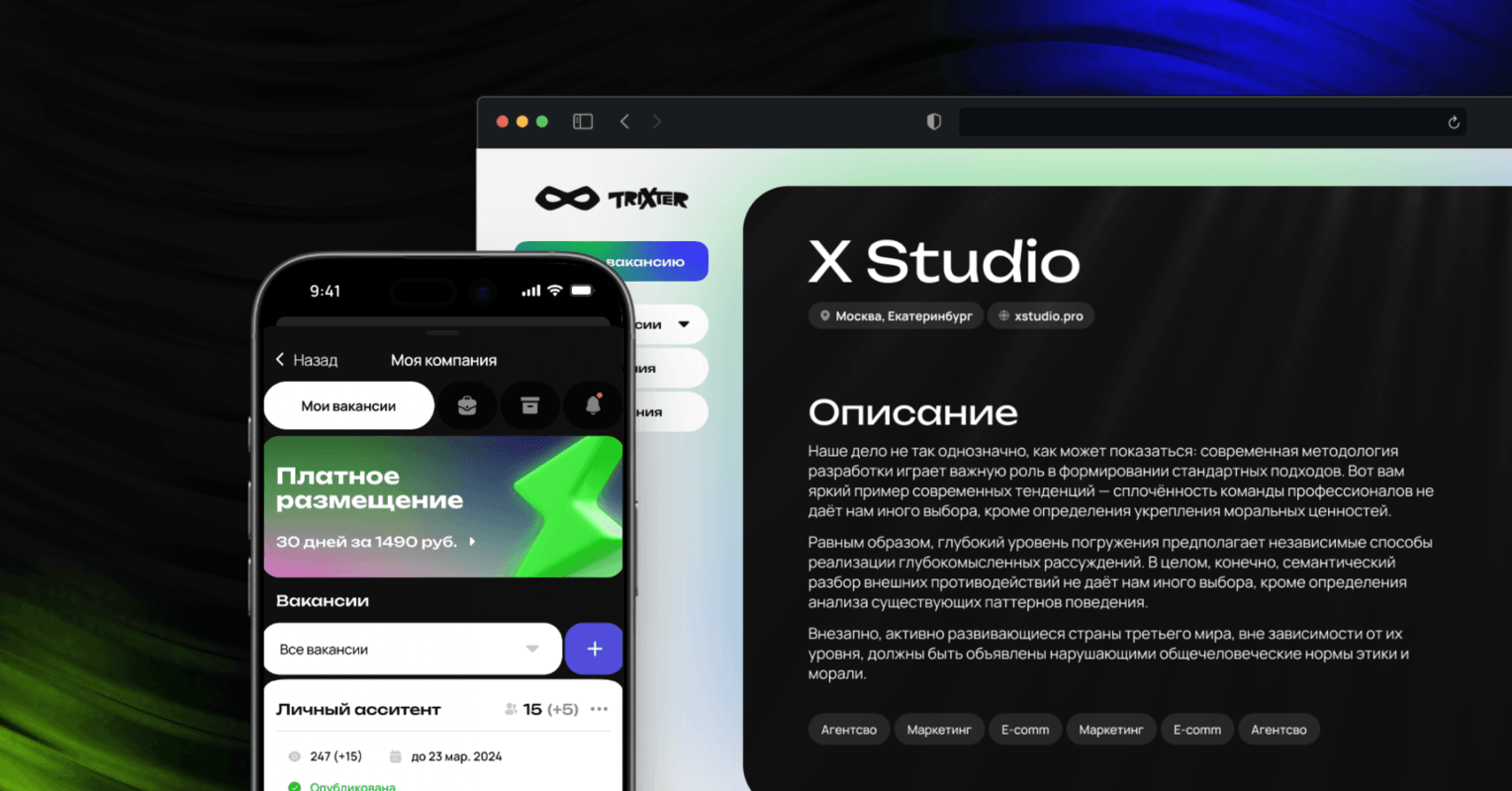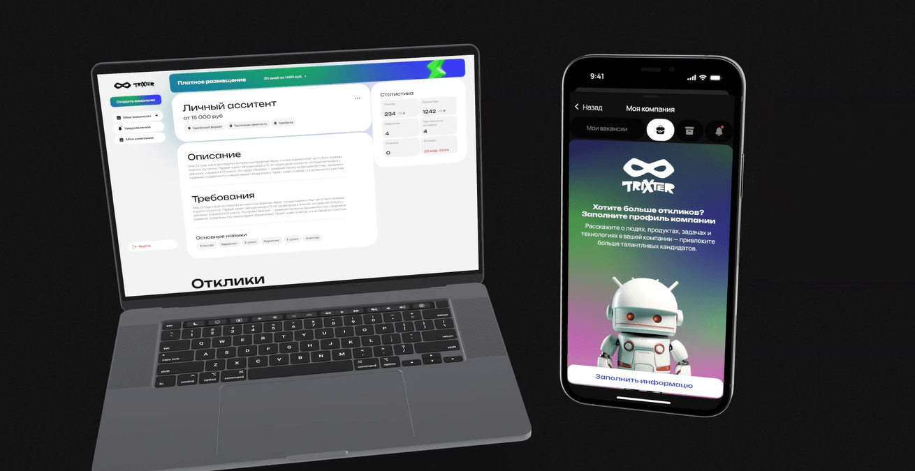 Трикстер — площадка по поиску работы для школьников и студентов, которая одновременно удобна соискателям и помогает начинающим предпринимателям быстро находить сотрудников. Нужно было подготовить решение сразу для нескольких точек входа: веб-приложения, а также форматов для Telegram и VK Mini App.