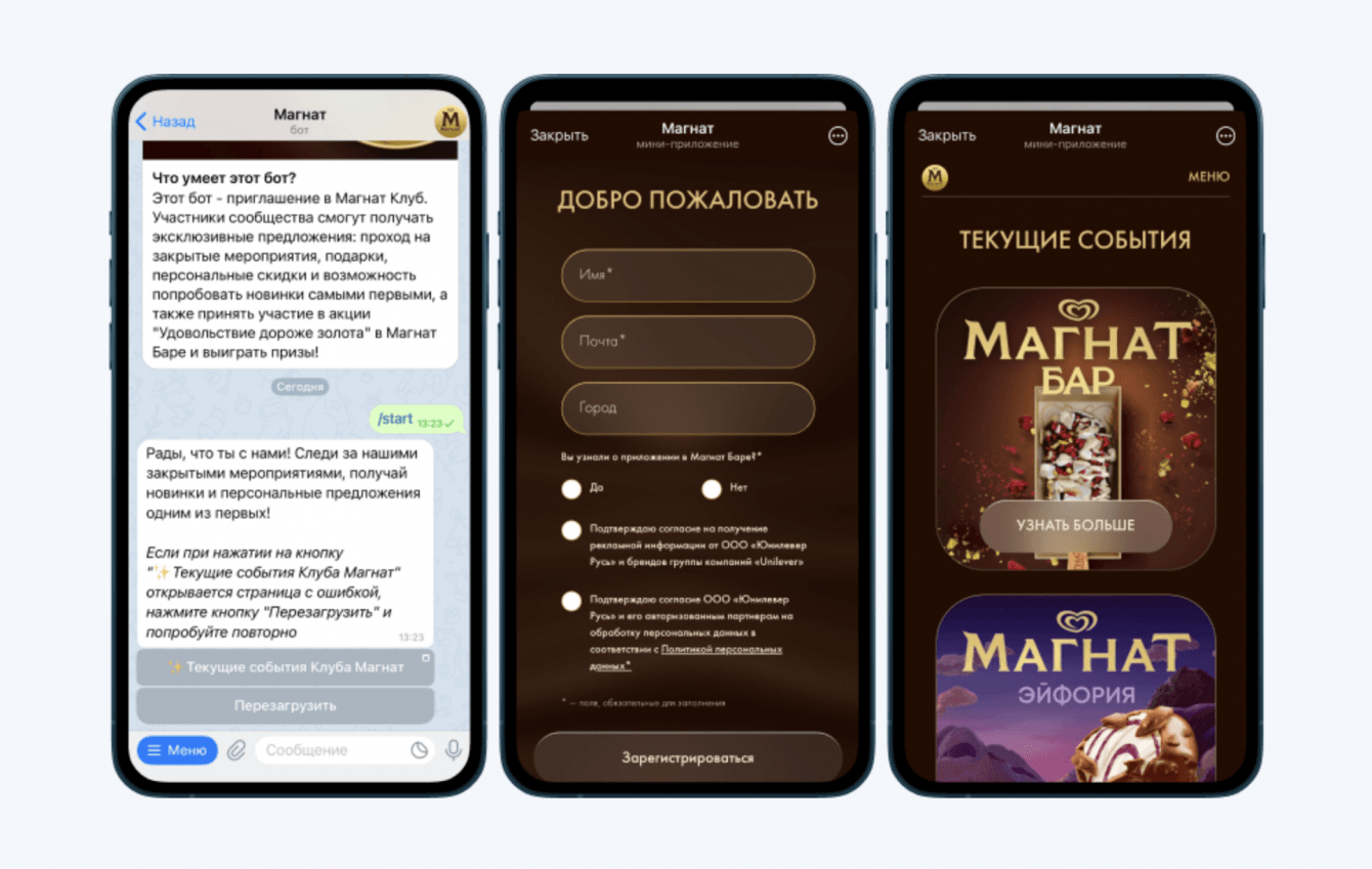 В рамках события «Магнат бар» пользователи получают возможность собрать свой собственный вкус мороженого и получить скидку на продукцию компании в офлайн точках в Москве, Новосибирске и Екатеринбурге. Процесс сборки мороженого состоит из четырех шагов: основа мороженого, шоколад, три топпинга, декор. Результатом сборки является страница с кастомным мороженным, скриншот которой необходимо будет показывать на кассе.