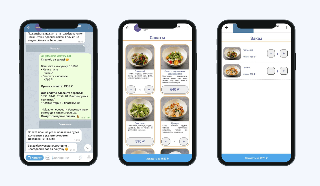 Вот и подъехал первый пример разработанного нами веб-бота в Телеграмм. Спустя месяц после добавления WebApps в Телеграмм к нам обратился первый клиент с просьбой разработать бота в данном формате. Мы были только рады, так как к тому моменту уже полностью разобрались в деталях такого рода проектов. Сам бот представляет собой каталог с возможностью оформления доставки.
