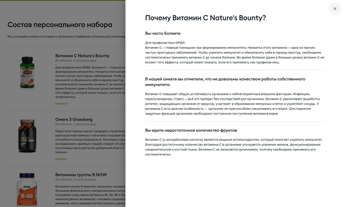 Наша задача была убедить пользователя, что рекомендациям можно доверять, что они точно помогут решить его проблему или достичь цели. Ну и главное, сконвертировать пользователя в покупку набора – важно было показать, что сервис занимается не рекомендациями, а составлением и продажей индивидуального набора витаминов.