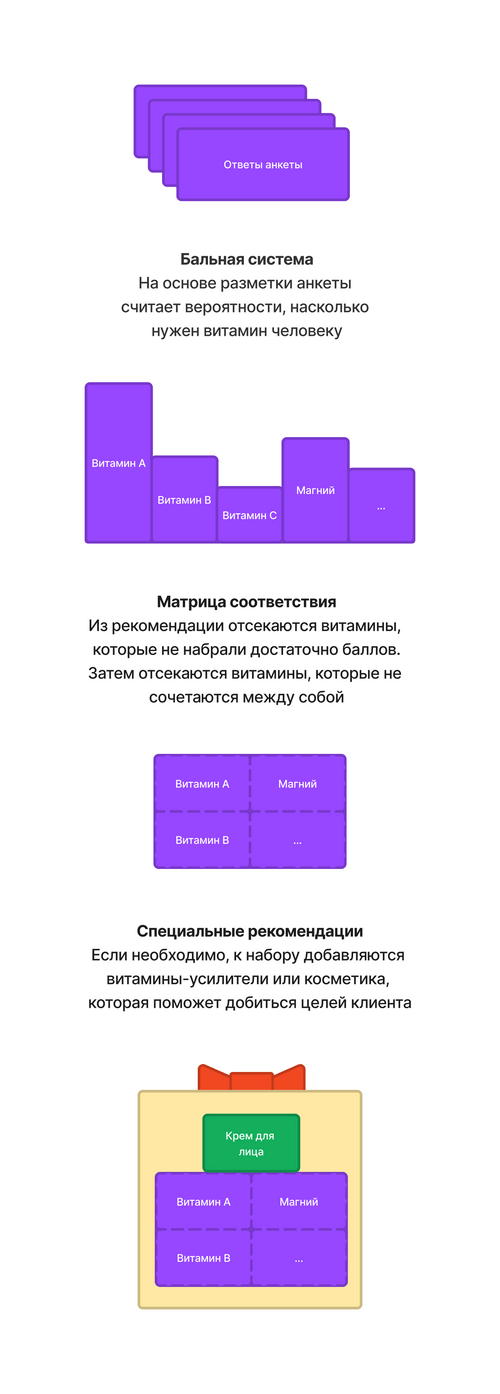 На базе нашего конструктора врачи разработали анкету, состоящую из ~140 вопросов. Чтобы превратить ответы пользователя в рекомендацию мы разработали специальный трехступенчатый алгоритм.