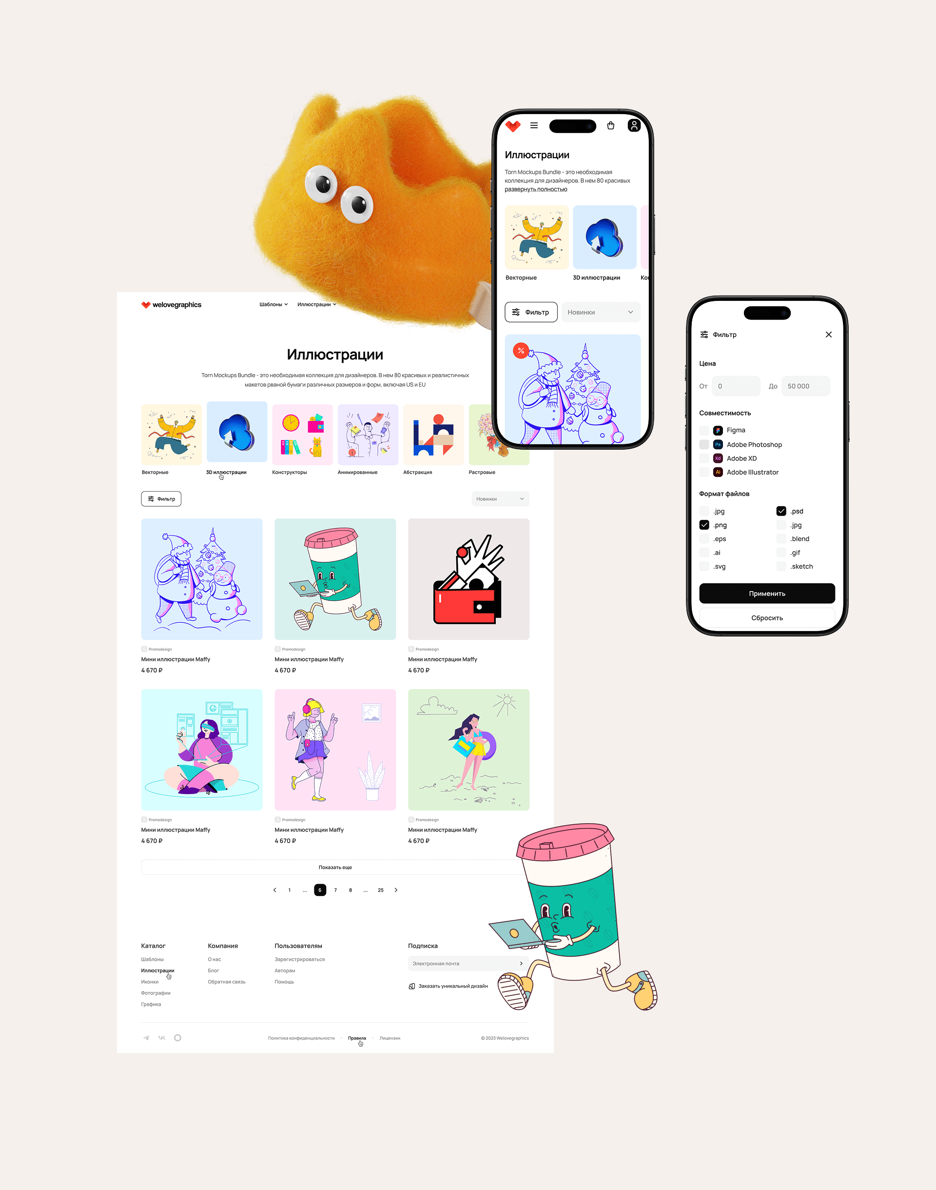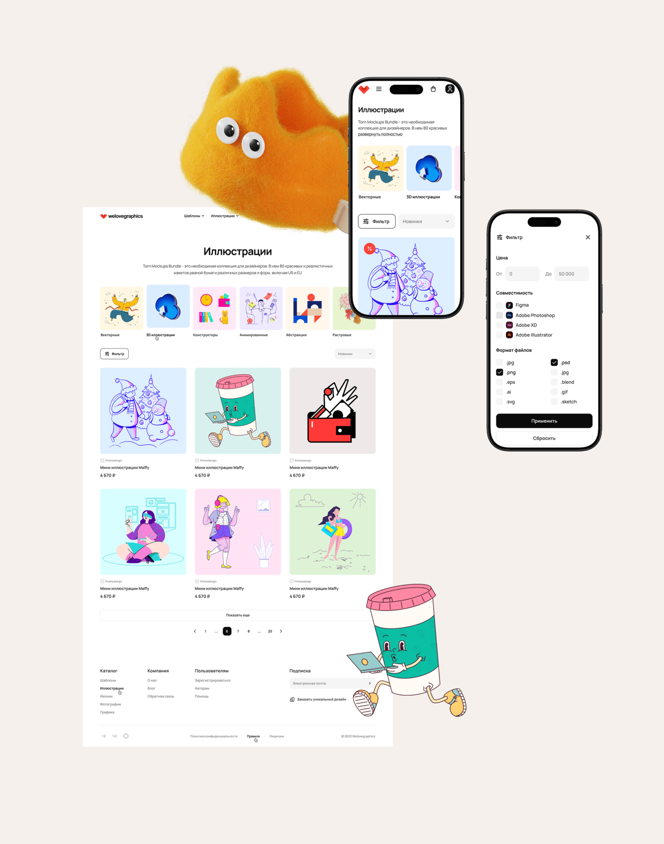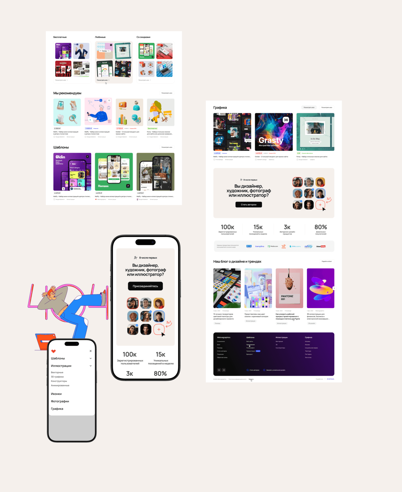 Мы разработали современный маркетплейс цифровых дизайн продуктов, на котором авторы могут разместить свои работы, а пользователи – купить или заказать доработку. Сервис развивается в сторону интеграции различных платформ ИИ, которые дадут больше возможностей для создания качественного графического контента и другого функционала.