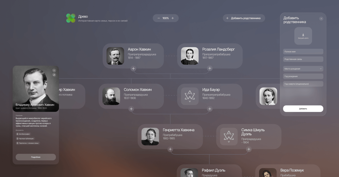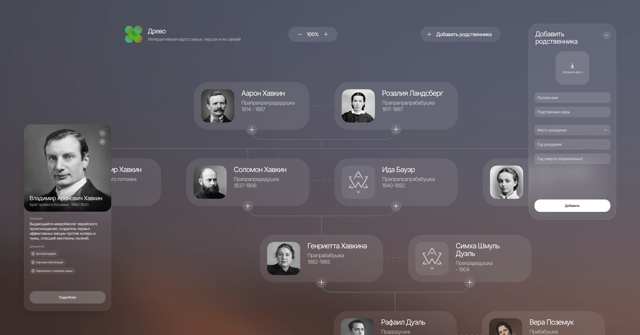 Финальным этапом стало проектирование древа как центрального элемента навигации по платформе. Пользователь добавляет узлы, выстраивает связи, прикрепляет фотографии.