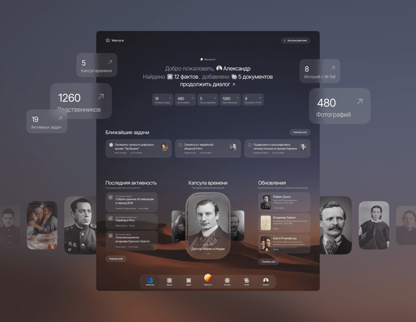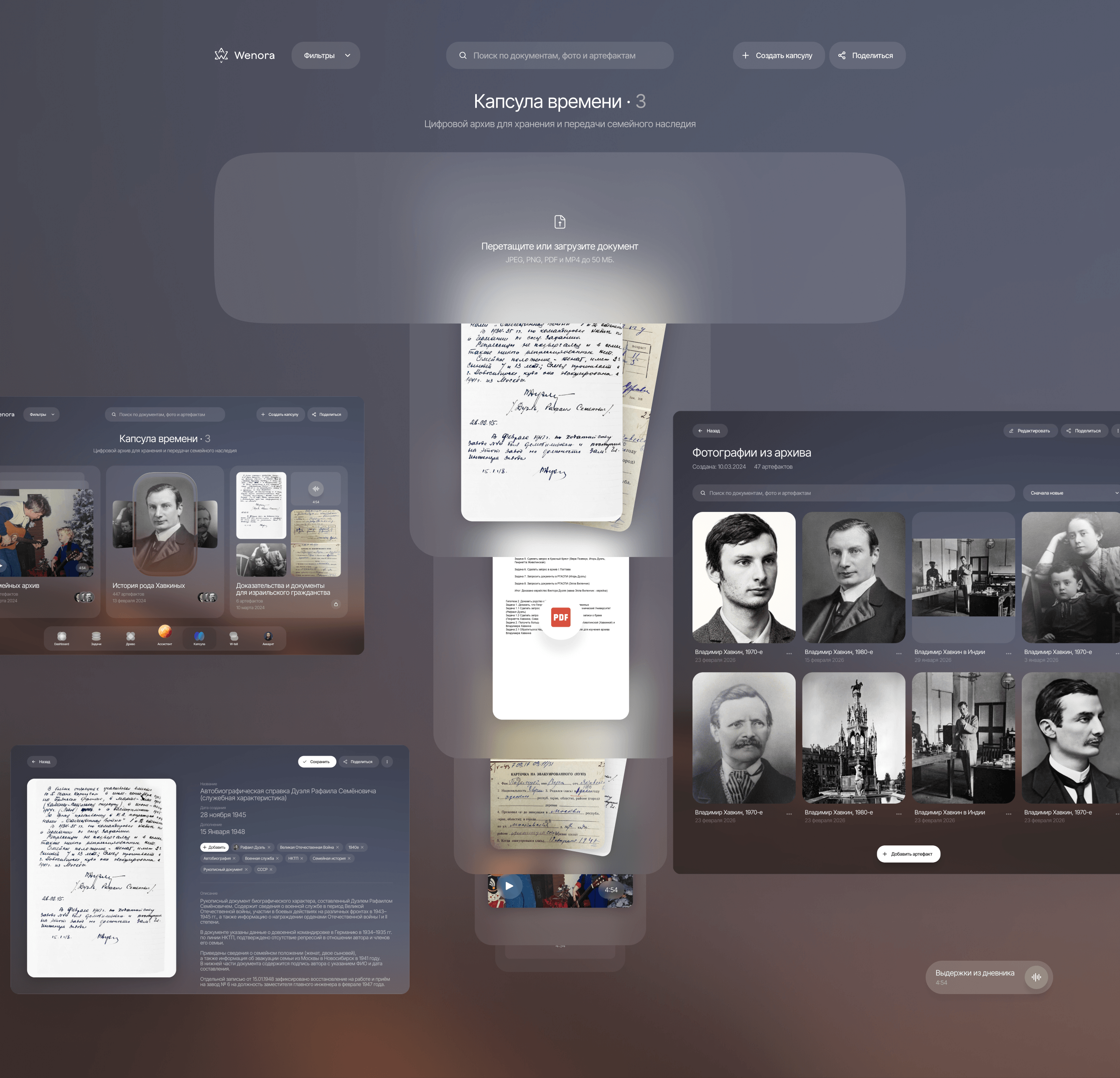 Проект стал для студии важным опытом работы с нестандартной задачей. Wenora не вписывалась в привычные категории — здесь нужна была гибкость, насмотренность и готовность уйти от шаблонов. Мы активно использовали AI-инструменты: Figma Make для быстрого прототипирования, нейросети для «оживления» старых фотографий родственников.