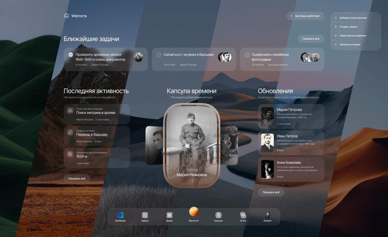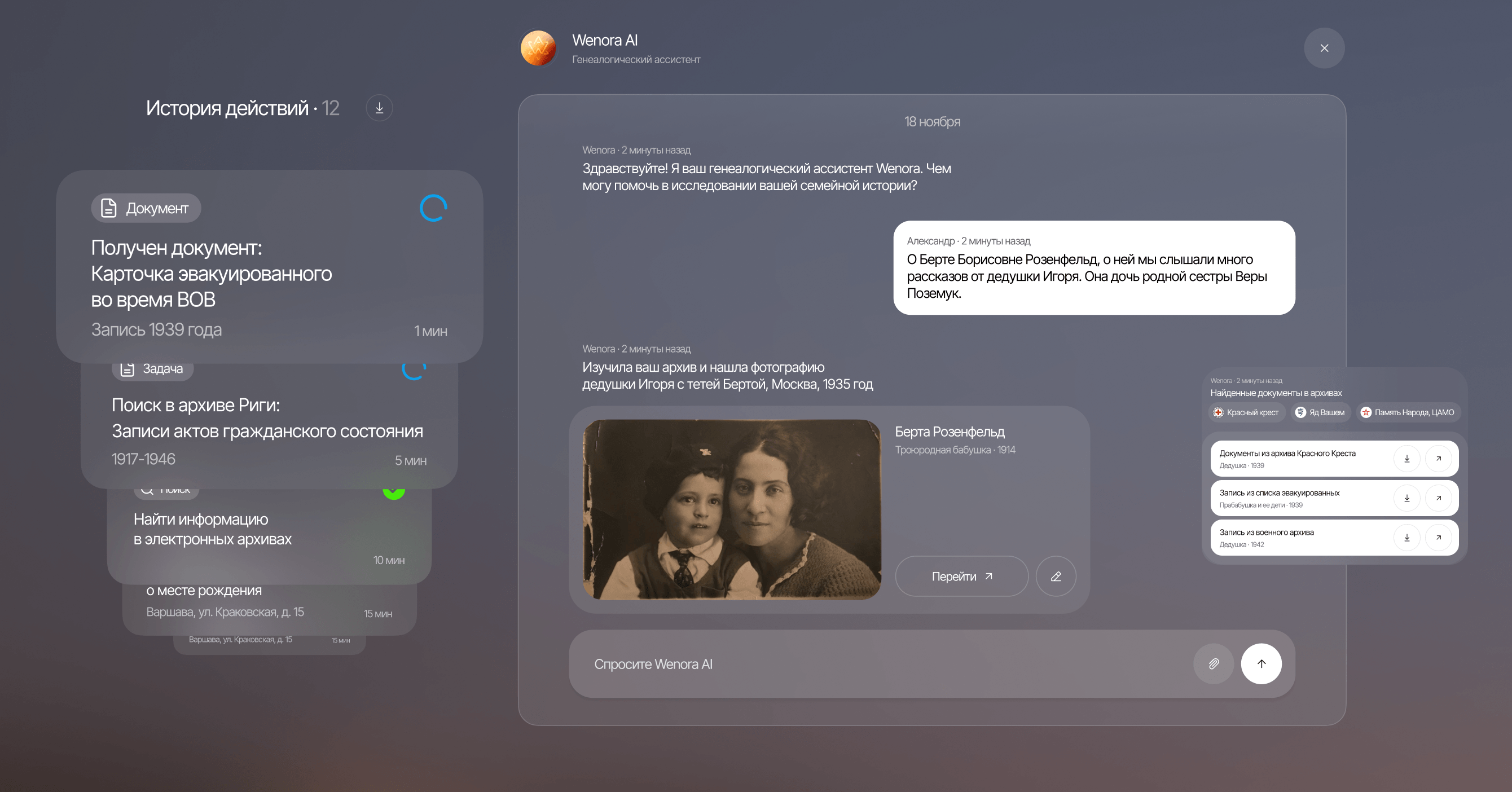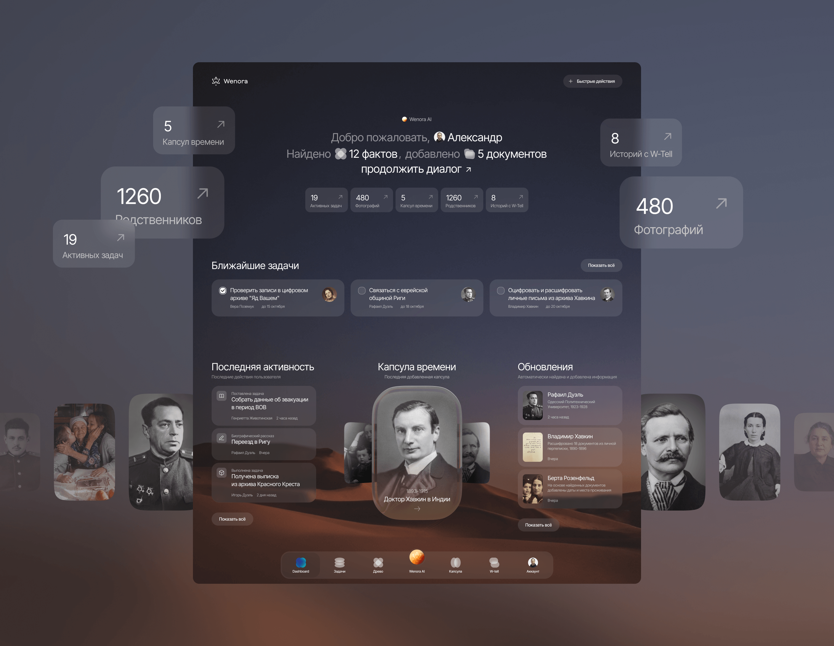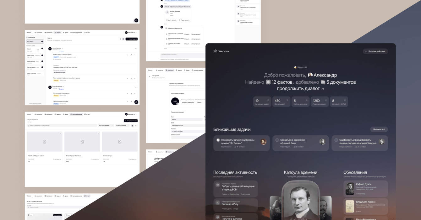 Wenora — AI-платформа для поиска и сохранения семейной истории. Сервис превращает архивные данные и воспоминания в живые истории, помогая людям осознать свои корни и передать память следующим поколениям. Целевая аудитория — люди среднего и старшего возраста, которые дошли до интереса к истории своей семьи и хотят сохранить её для детей и внуков.