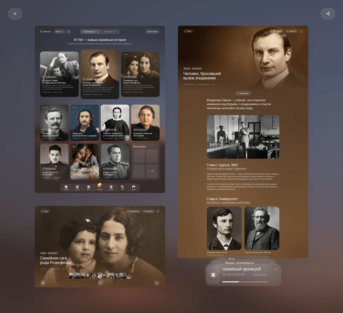 Продумали механики медиа-генерации: архивы превращаются в видео, анимации, коллажи, story-cards и таймлайны. Заложили сценарии совместного участия — семья добавляет воспоминания, фото, комментарии. Связали с капсулами времени: истории можно сохранить на будущее или опубликовать.