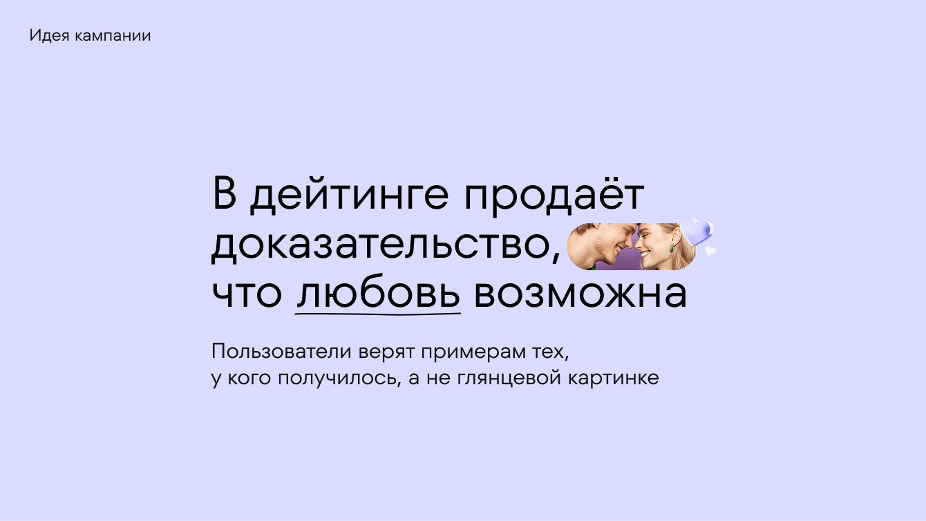 Мы поняли: чтобы завоевать доверие этих людей, бессмысленно транслировать глянцевые образы и «сказочные» истории знакомств. Вместо этого мы решили показать истории «реальных» пользователей, которые нашли партнёра с общими ценностями и интересами.