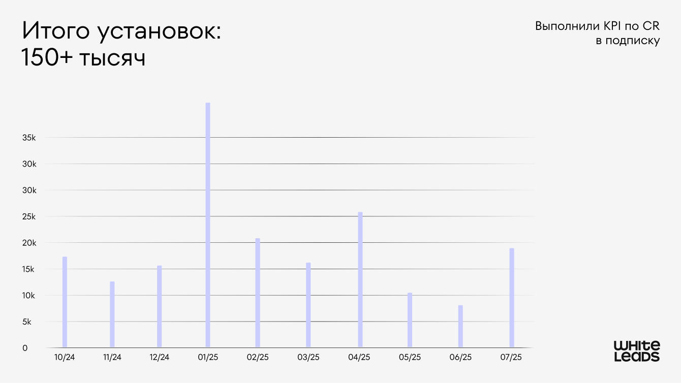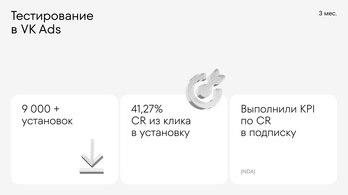 Мы предложили работать по модели CPI — с оплатой за установку — и гарантировали конверсию, близкую к органике. Так можно было масштабировать кампанию, тестировать больше гипотез в креативах и сохранять качество трафика.