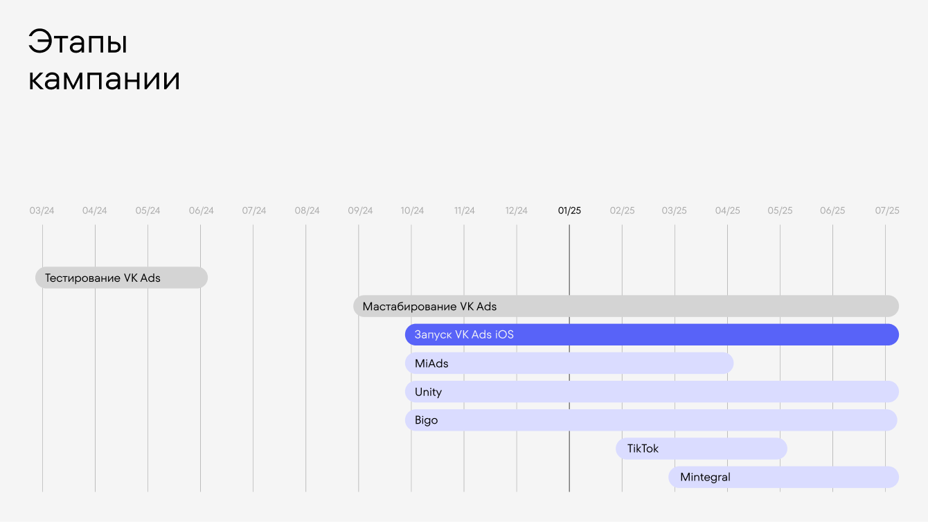 Для привлечения аудитории мы выстроили гибкий медиамикс. Тестирование гипотез проводили в VK Ads. А на этапе масштабирования подключили дополнительные каналы: Mintegral, TikTok, MiAds, Bigo и Unity.
