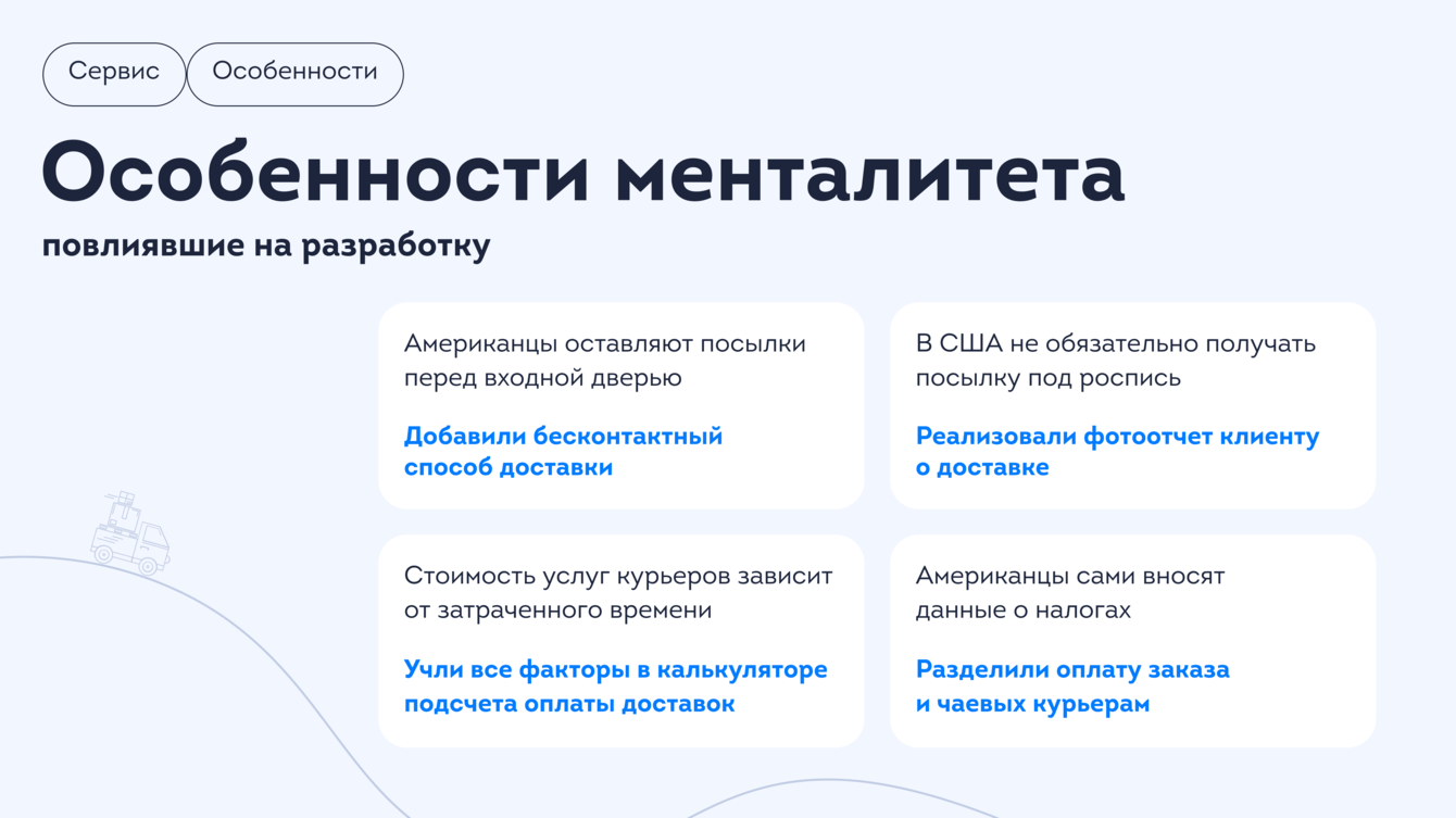 Whoosh мы создавали для иностранной аудитории. При разработке мы учли особенности метрических систем, формата времени и налогообложения в Америке. Многое из этого быстро и без ошибок отработали благодаря отзывчивости заказчика. Так и родился Whoosh.