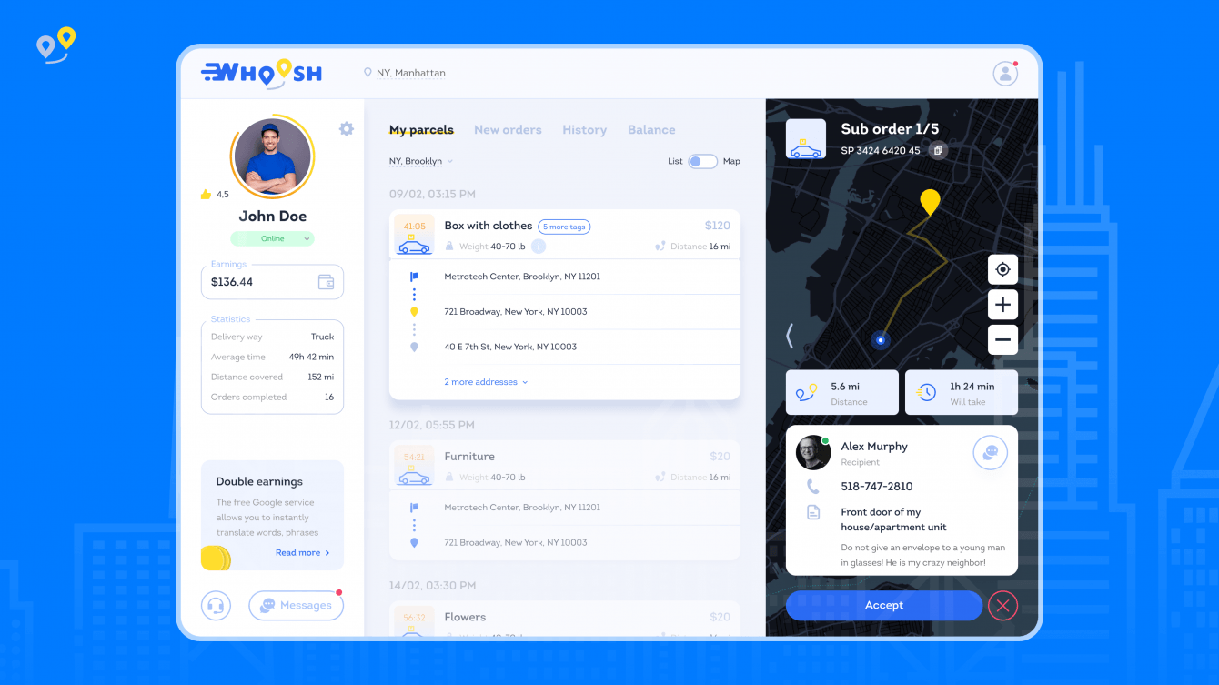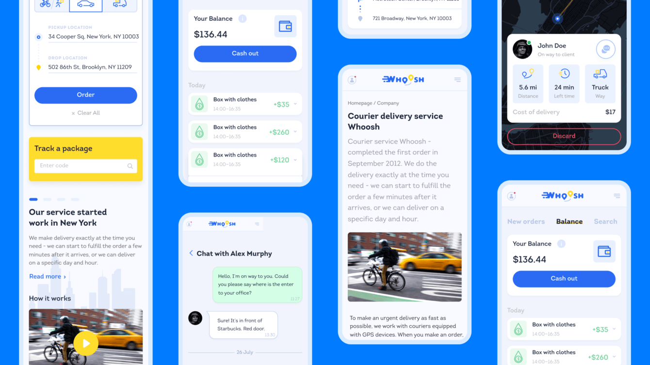 История проекта Whoosh началась в 2020 году. Заказчик обратился к нам для создания онлайн-сервиса экспресс-доставки по Нью-Йорку. Нужно было разработать удобный сайт, который станет логистическим партнером для бизнеса и площадкой для курьеров, ищущих работу.