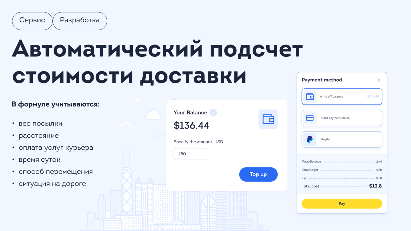 Благодаря этому курьер видит, сколько он получит за выполнение заказа, а клиент — конечную стоимость доставки. Если бы не учли мельчайшие детали, стоимость могла бы меняться в процессе. Это неудобно ни для того, кто отправляет посылку, ни для курьера. Могли бы возникнуть спорные ситуации, которые трудно решить в онлайне.
