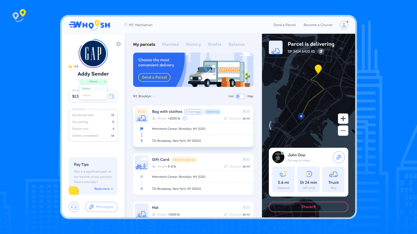 Отправитель посылок может оставлять заявку, отслеживать перемещение курьера и контролировать статус доставки. Там же он может пополнить кошелек, оплатить заказ и оставить курьеру чаевые.