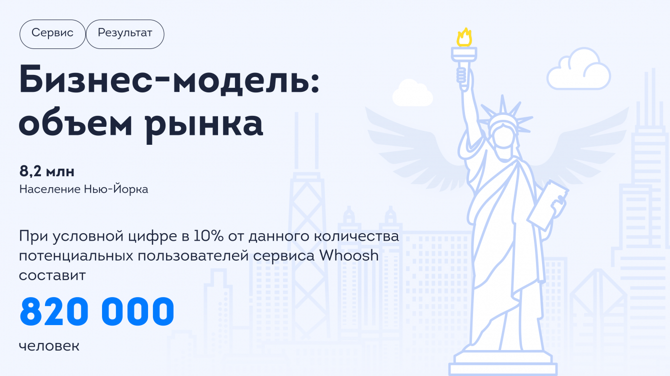— В Нью-Йорке проживает 8,2 млн человек. Если представить, что 10 % горожан будут отправлять посылки через Whoosh, сервисом будут пользоваться 820 000 человек. При таком прогнозе есть смысл продвигать и монетизировать проект.