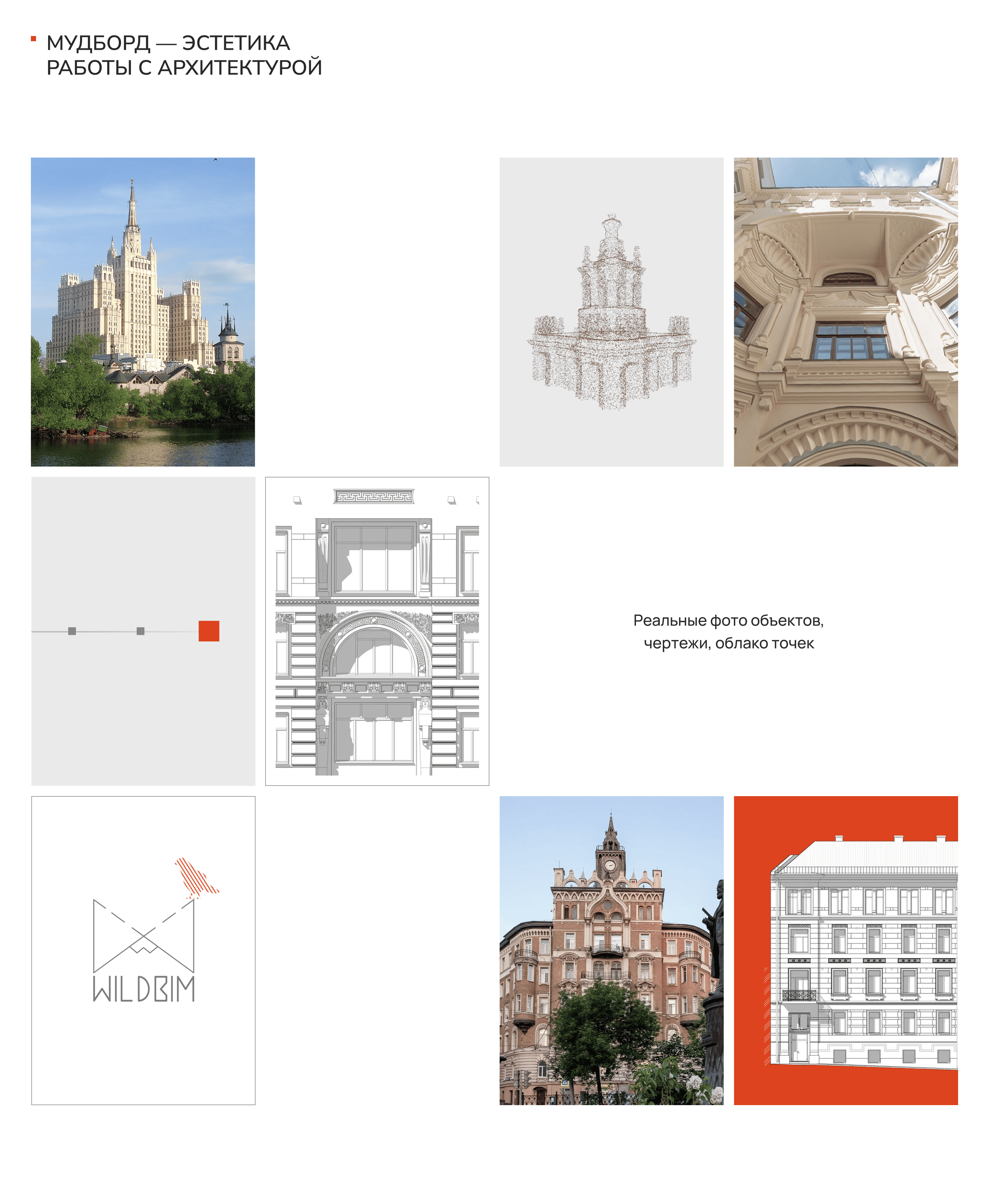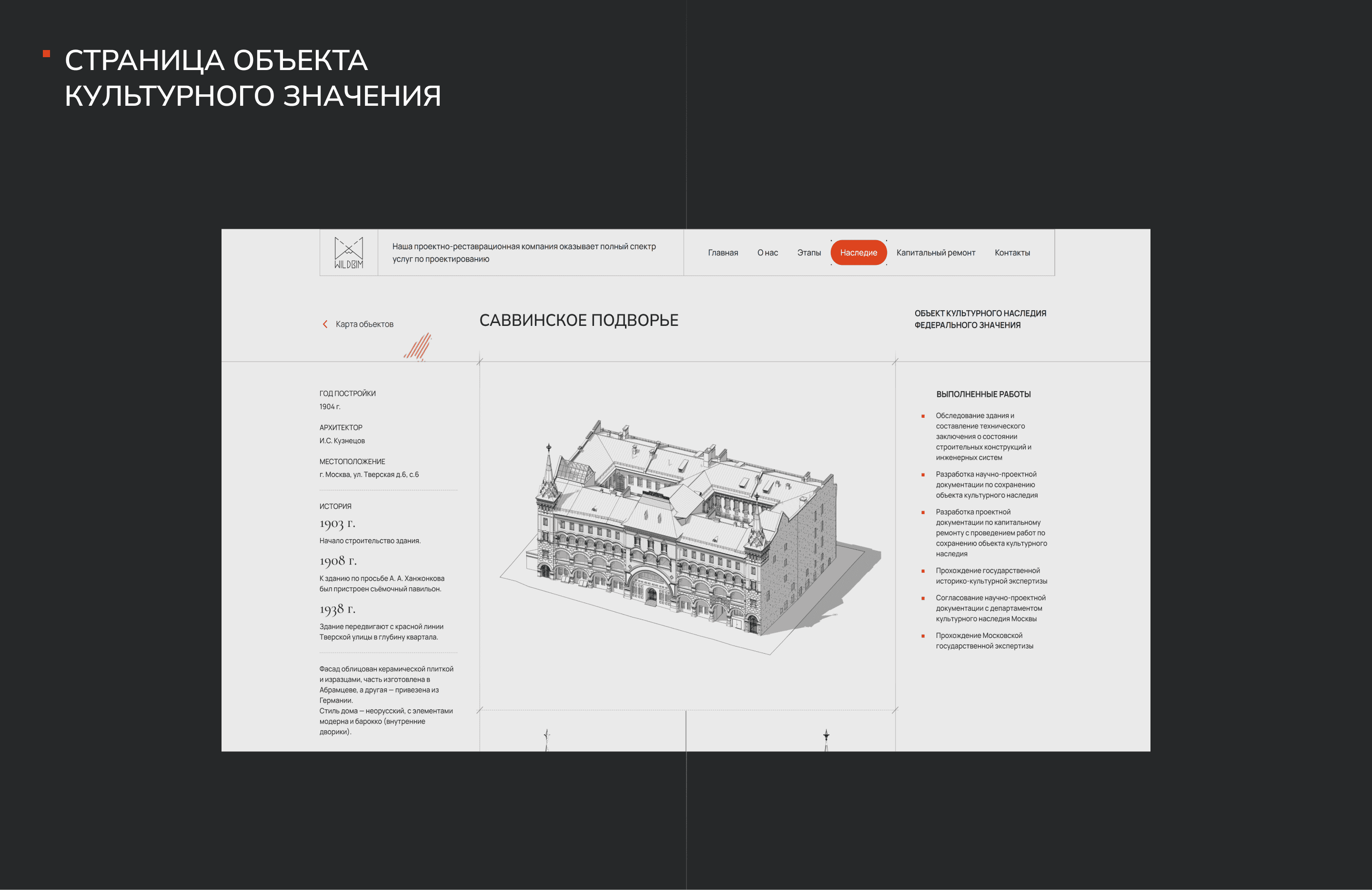 Также у клиента сильные кейсы — WILDBIM работает с историческим наследием Москвы. В портфолио компании — знаковые объекты столицы, например, Саввинское подворье, гостиница «Украина» и другие сталинские высотки. Блока с портфолио на сайте не было — а это визитная карточка и сильная сторона бюро.